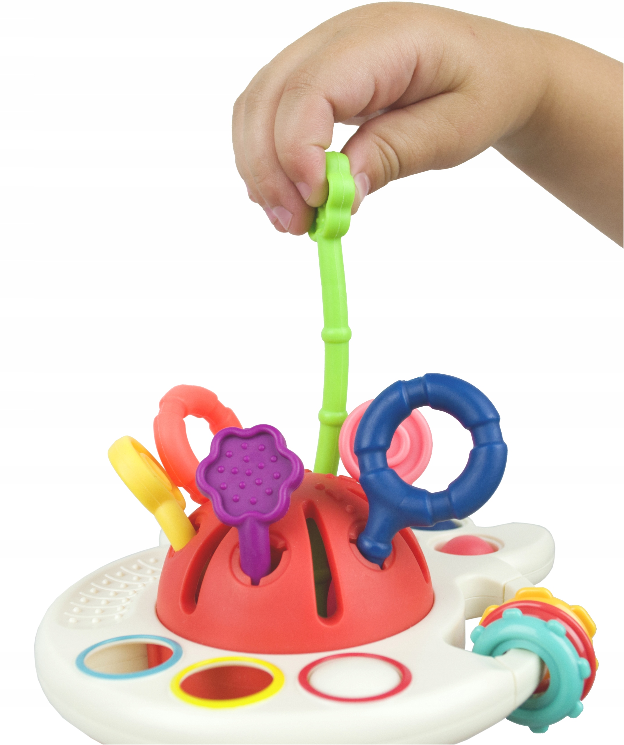 Малыш может коснуться 6 силиконовых ниточек разного цвета, установленных в центре игрушки. Каждый из них имеет разный цвет, текстуру и окончание. Это рай для осязания! Струны можно протянуть через силиконовый шарик. Внутри находится маленький гремящий шарик, который делает игру еще более привлекательной, стимулируя чувство слуха. И звенья, и центральный шарик покрыты выступами и прекрасно выполняют функцию прорезывателей. Игрушка спроектирована таким образом, чтобы ребенок мог легко взять ее в маленькие ручки.