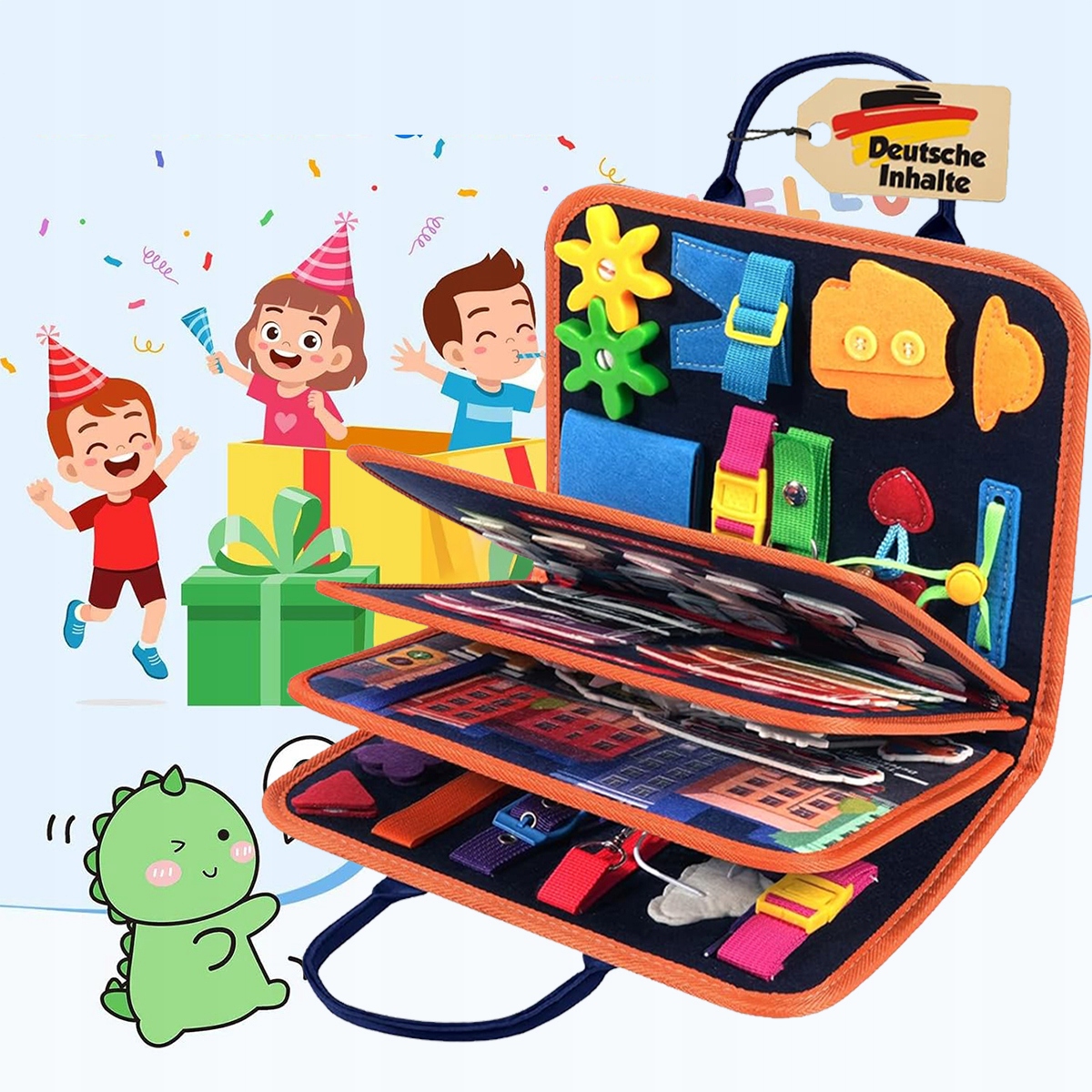 - 🎉8 СТРАНИЦ, БЕСКОНЕЧНОЕ ВЕСЕЛЬЕ — Наша игровая доска состоит из 8 страниц, которые будут развлекать вашего малыша часами. Эта игровая доска Монтессори была разработана с разными уровнями сложности, чтобы она была сложной, но не слишком сложной и чтобы заинтересовать малышей. К ним относятся пряжки, молнии, шнурки, ремни, пуговицы, часы, календари, фигуры, цифры, алфавиты на липучке, пазлы с животными и многое другое (немецкое издание).