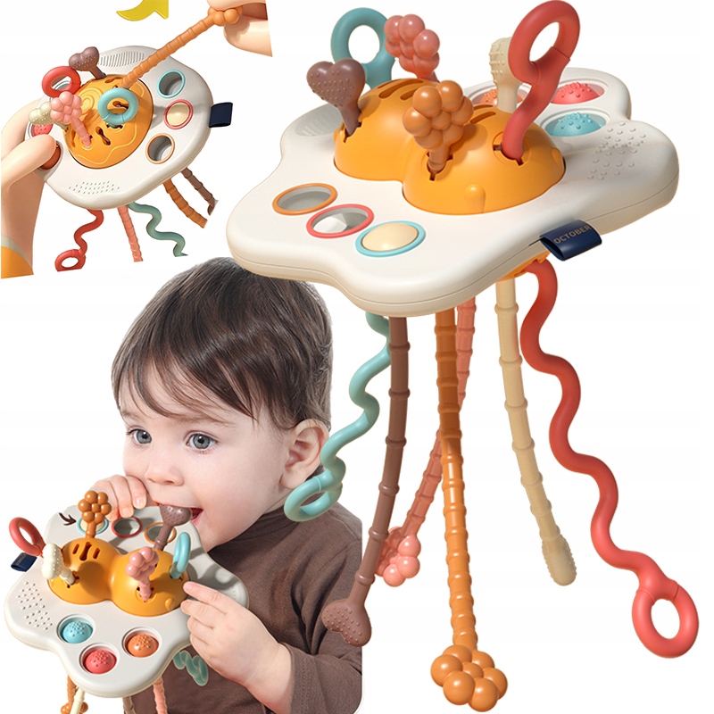 Сенсорная игрушка Монтессори Прорезыватель «Буксир» в форме НЛО от бренда WOOPIE – это не только отличное развлечение, но и инновационный способ поддержать развитие вашего малыша. Он поощряет открытия через органы чувств, фокусируется на развитии координации и моторики, а также облегчает дискомфорт, связанный с прорезыванием зубов. В набор входят красочные, безопасные и удобные для захвата струны с различной текстурой, которые стимулируют активность и исследование, а также облегчают период прорезывания зубов. Если потянуть за веревку, возникнут разнообразные звуки и вибрации. Кроме того, игрушка оснащена 2 рядами программных кнопок, поощряющих прикосновение и нажатие. Приподнятое положение стимулирует любознательность ребенка и тренирует ловкость мизинцев. Этот сенсорный прорезыватель станет идеальным подарком для ребенка, который сочетает в себе развлечение и обучение. Благодаря этому вы можете обеспечить здоровое развитие вашего ребенка и часы увлекательного веселья. Обеспечьте комфорт и развитие своему малышу!