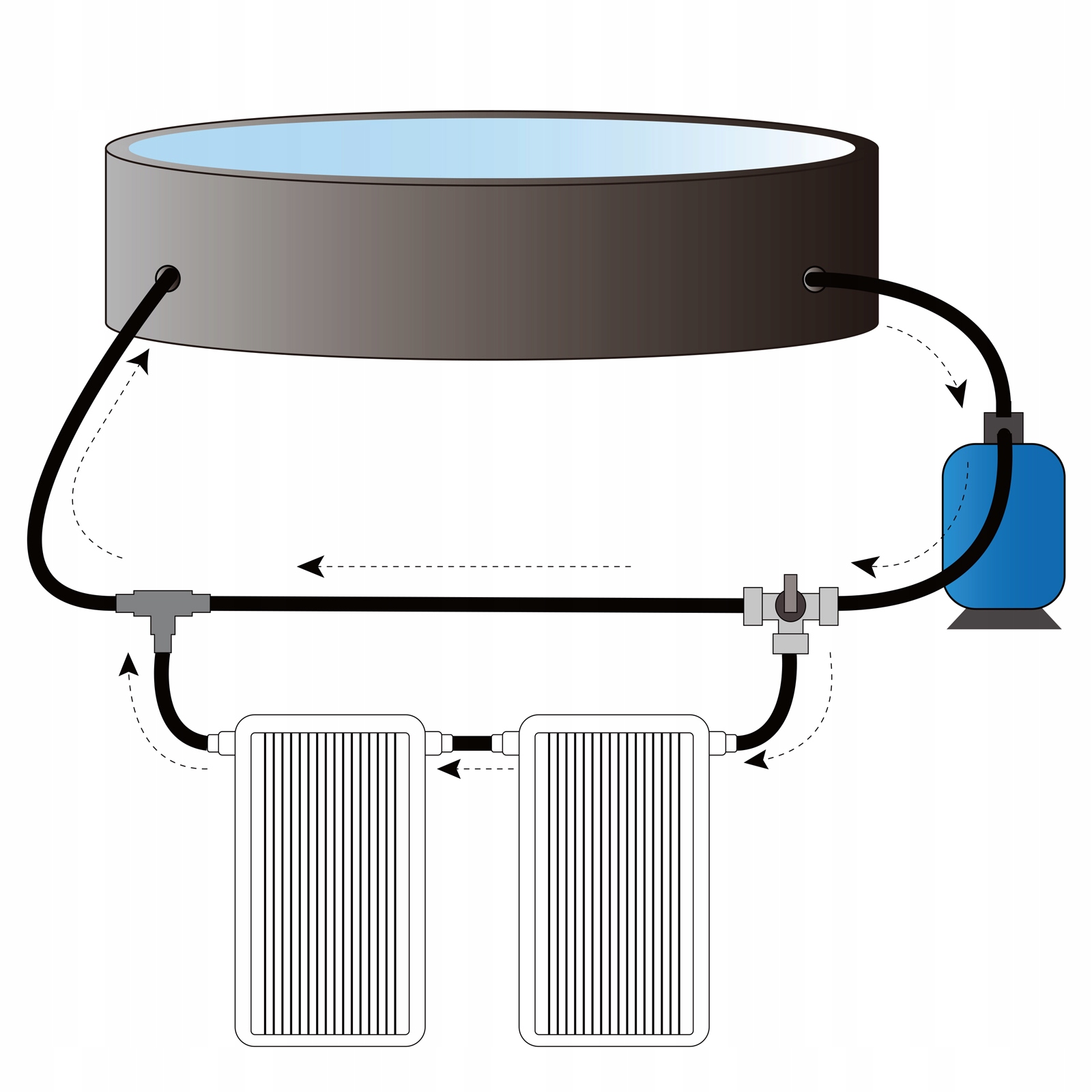 Это продлевает время пребывания воды в солнечном коллекторе. Таким образом, вода в бассейне нагревается быстрее. Переходник 2 в 1 позволяет подключать шланги диаметром от 32 до 38 мм.