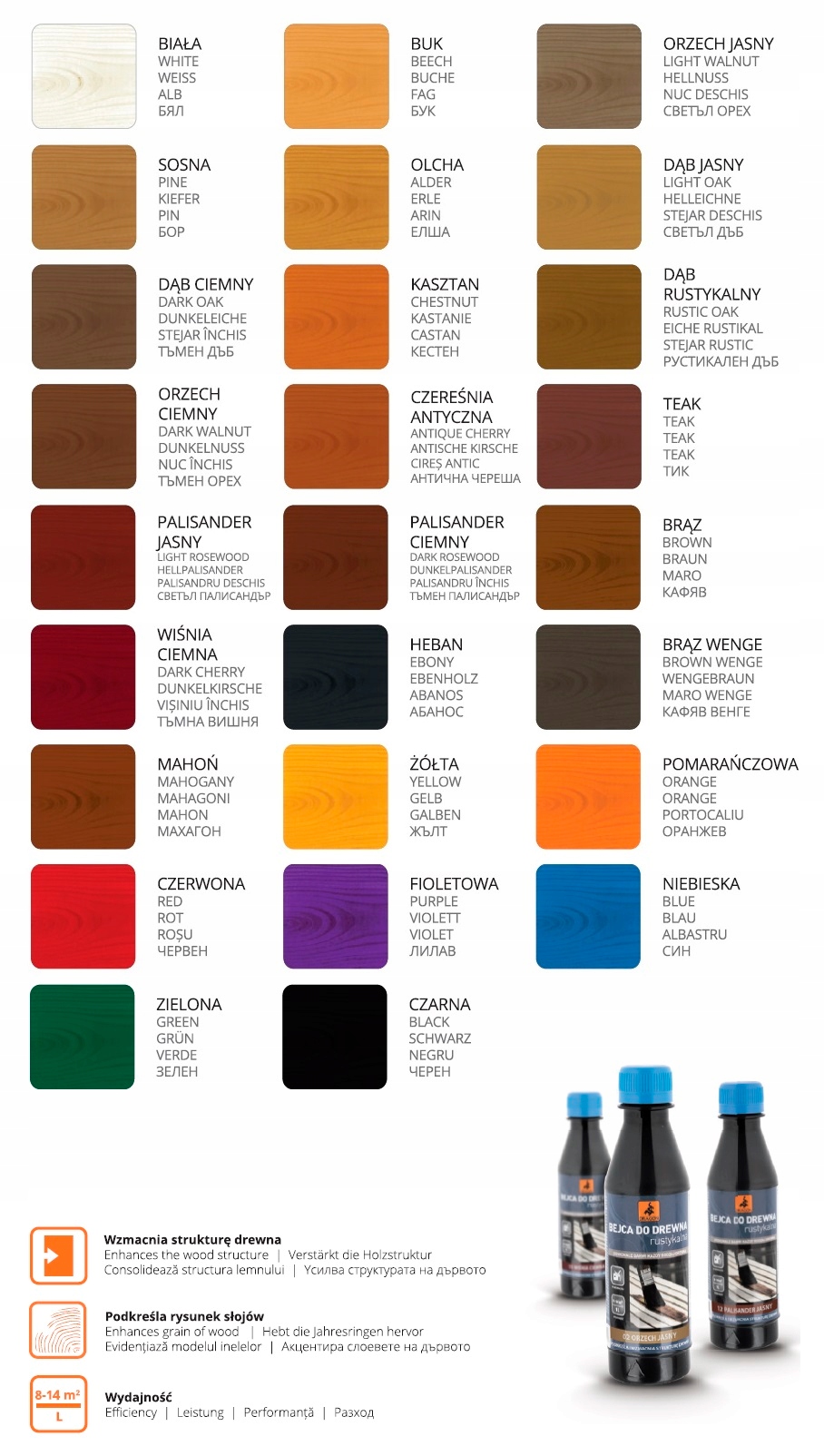 4. Тщательно перемешайте содержимое упаковки. Для получения более темного цвета наносят еще один слой примерно через 10 минут. 0,5 ч. Окрашенные поверхности после высыхания можно покрыть лаком на основе растворителя, нитроцеллюлозным, акриловым, полиуретановым или водным лаком.