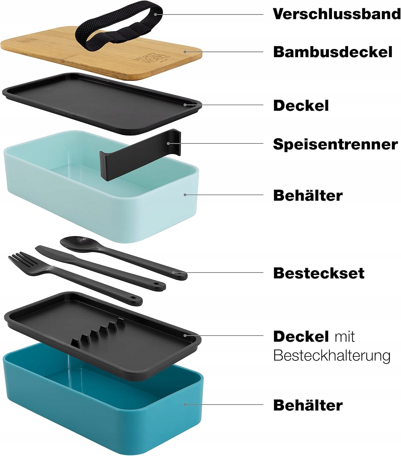 С коробкой на обед Moritz & Moritz Bento, набор столовых приборов на съемочной площадке идеально оборудован для того, чтобы насладиться ужином, завтраком и закусками в течение долгого времени со свежестью и вкусом. Наша прохладная коробка состоит из 2 контейнеров, ок. 680 мл, набор столовых приборов, 1 вставка разделения, 2 промежуточные крышки - с 1 x с держателями ножей, вилкой и ложкой - 1 бамбуковая крышка и 1 ремень для безопасного транспортировки посуды.