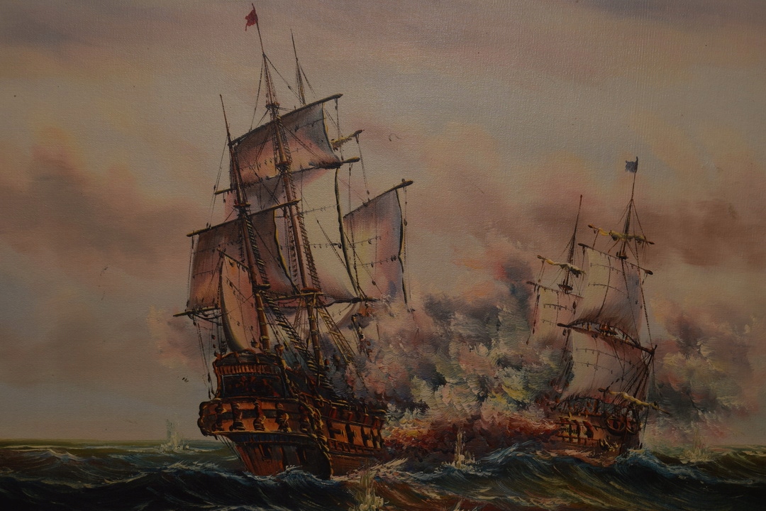 Морський бій два кораблі - Морський - Картина маслом Матрос - Золота рамка