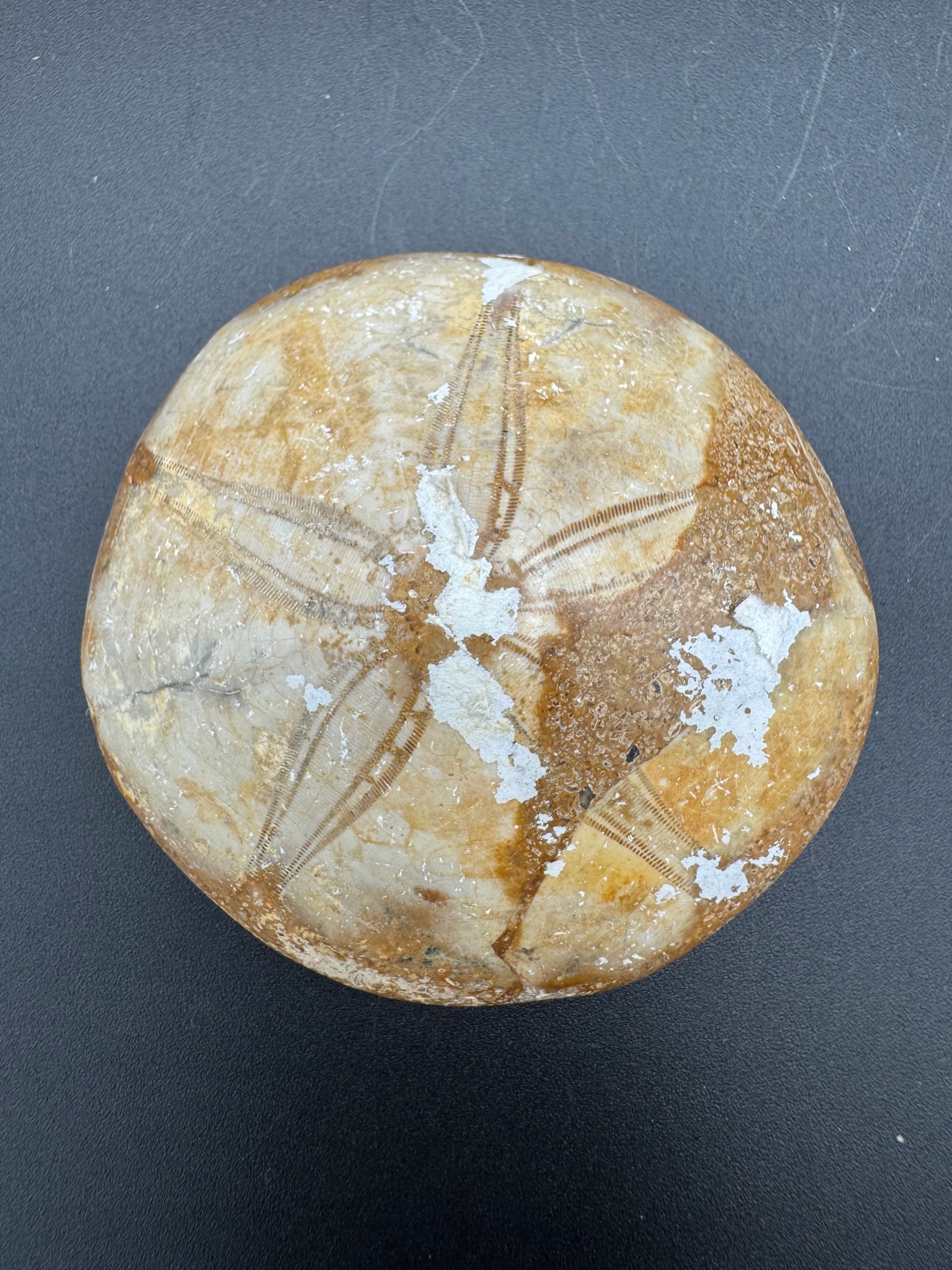 Морской еж Pygurus Marmonti —это ископаемое вымершего вида морского ежа. Его тщательно отполировали, чтобы выявить детали поверхности, и он датируется позднеюрским периодом, примерно 160 миллионов лет назад. Это очень уплощенная форма морского ежа из отряда Clypeasteroida. Как иглокожее, он имеет пятикратную симметрию организации тела, водную сосудистую систему и внутренний скелет, состоящий из пластинок кальцита. Они живут на мелководье в морской среде чуть ниже линии прилива, погребенные в песке или иле. Обычно они имеют круглую форму, хотя некоторые из них имеют сплющенные или зазубренные стороны. При жизни они покрыты бархатистыми шипами, которые используют для передвижения, как и другие иглокожие. Наиболее диагностическим показателем ископаемого Pygurus Marmonti является пятияйцевая форма на верхней стороне скелета. Они являются частью дыхательной системы и оставляют на скелете легко узнаваемый «цветок». Они являются активными хищниками, питаются личинками ракообразных, мелкими копеподами, диатомовыми водорослями и водорослями.