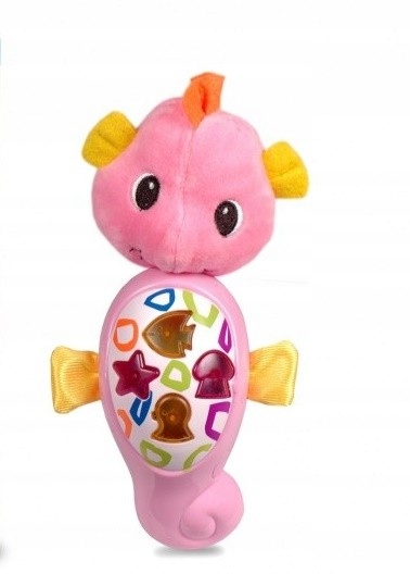 Интерактивный морской конек подходит для детей от 3 месяцев. Он изготовлен из красивого и мягкого плюша. Он имеет сенсорные, звуковые и световые функции. Он имеет четыре кнопки, поэтому вы можете услышать приятный звук или тихую колыбельную. Кнопки подсвечиваются. Морской конек развивает зрение и слух.