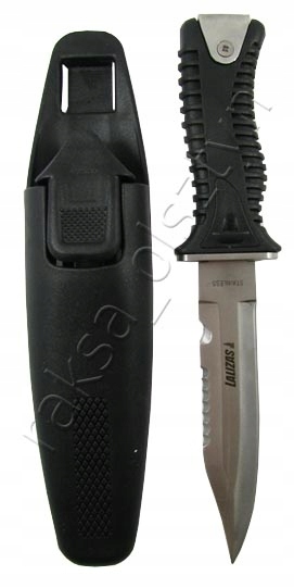 Большой водолазный нож. Лезвие изготовлено из нержавеющей стали, ручка – из ПВХ. Благодаря двум резиновым ремням с пряжками его легко прикрепить к ноге или руке, что делает его легко доступным и готовым к использованию в случае необходимости. Пластиковый кейс имеет защелку, которая предотвращает самостоятельное выпадение ножа.