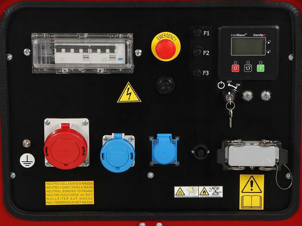 Панель управления содержит две профессиональные промышленные розетки: одну 16А и одну 32А. С главным выключателем и практичным вольтметром.