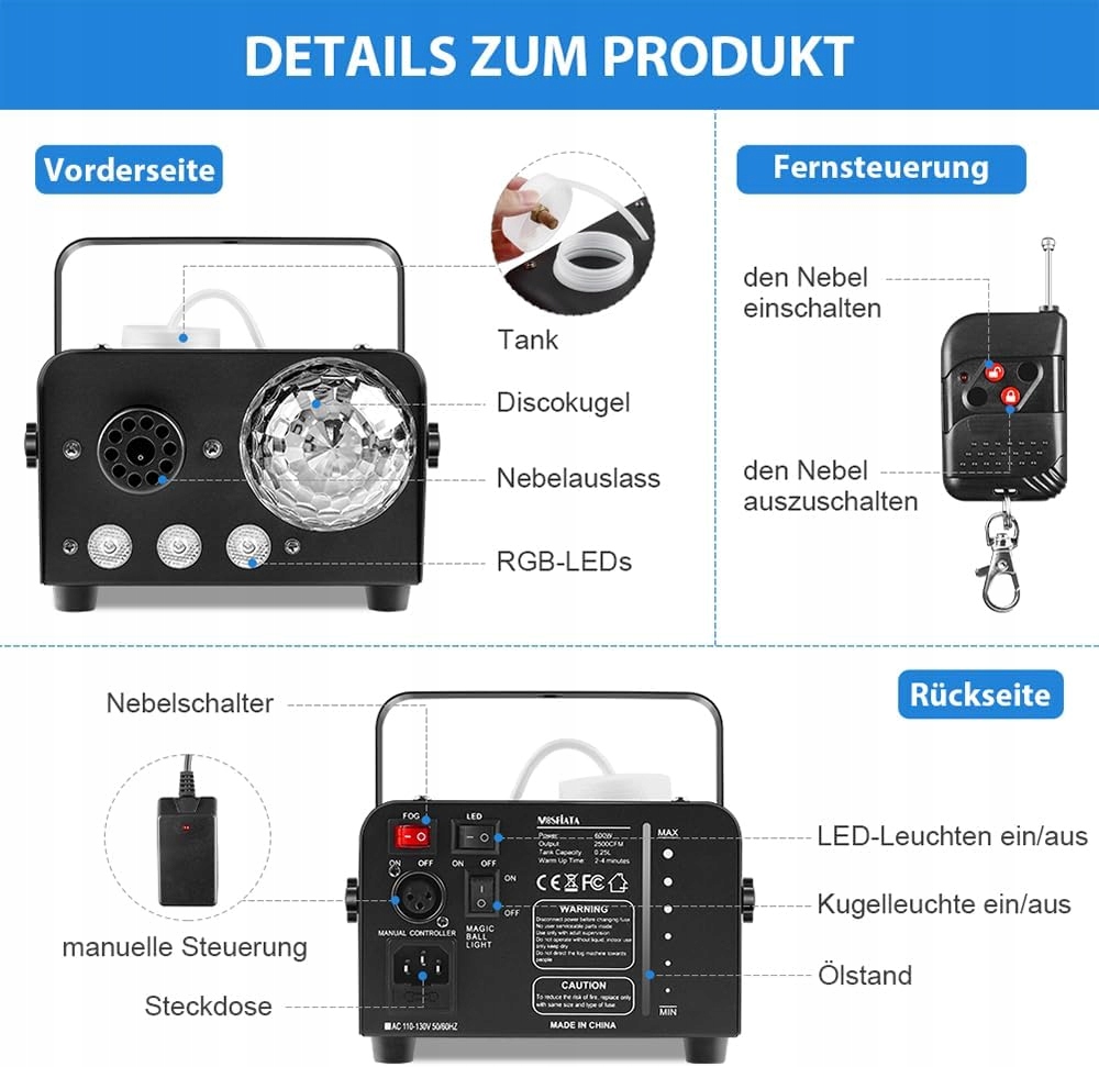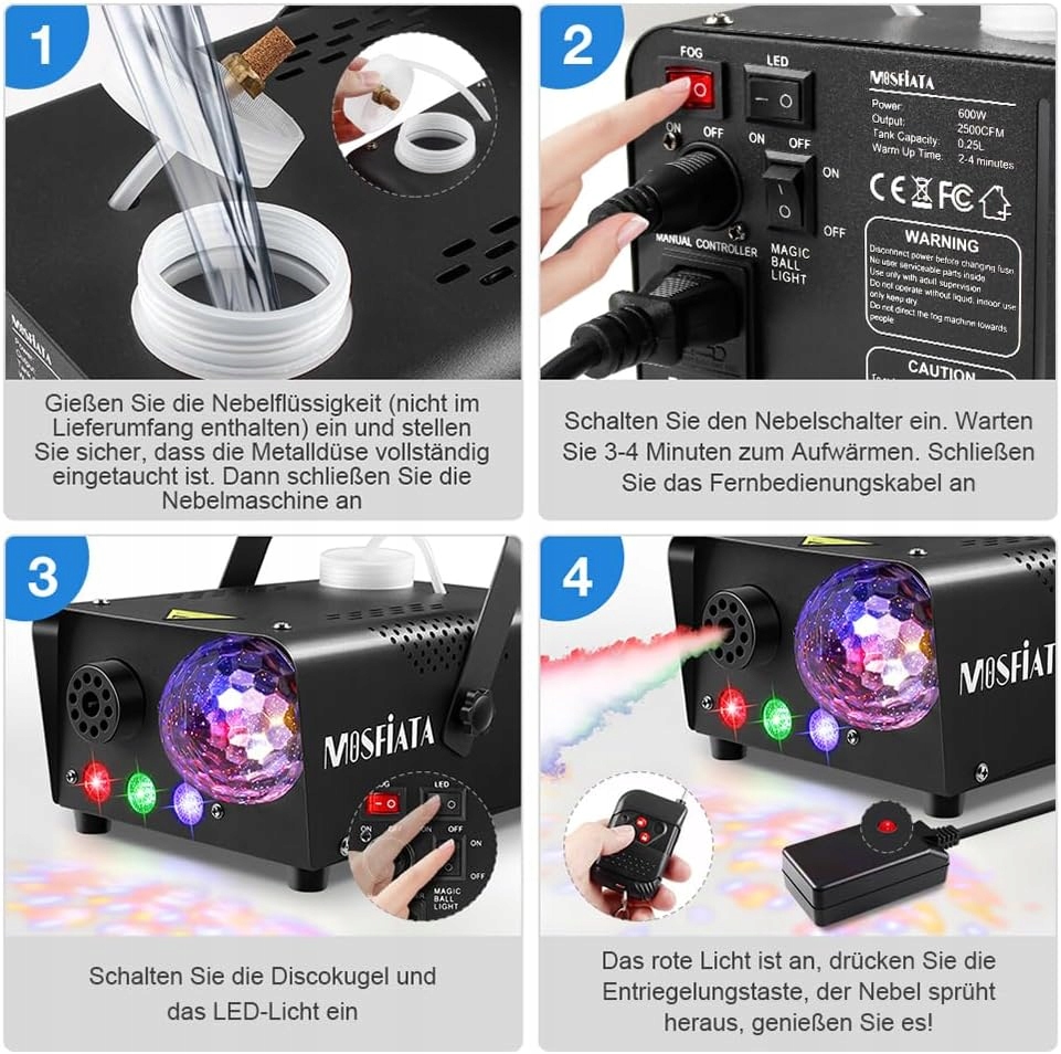Туманная машина с световым эффектом: эта туманная машина имеет дискотеку света и светодиодов RGB. Сочетание тумана и красивых осветительных эффектов делает ваши вечеринки действительно прохладными! Огни и туман могут работать или отдельно отличная производительность и прочность: устройство тумана оснащено 300 мл резервуаром для длительного производства тумана. Автоматическое отключение, если туманная жидкость пуста, все, что вам нужно сделать, дополнить резервуар, чтобы перезапустить машину. С толщиной 600 Вт, производительность тумана может достигать 2300 кубических футов (кубический фут в минуту) от 2-3 метров быстрого нагрева и интеллектуальной системы температуры: прогрессивная электронная система управления термостатами и специальная технология трубопровода позволяет машине согреться всего за 2. -3 минуты. Интеллектуальная система управления температурой автоматически оптимизирует производителя курения, когда она генерирует непрерывный туман, без проблем с простым в использовании перегрева: просто заполните жидкий бак, подключите кабель и включите его, а затем вы можете наслаждаться! Машина оснащена пультом дистанционного управления, ее беспроводной пилот может достигать 15 м (без препятствий), благодаря тому, кто хорошо работает издалека: дымовая машина небольшая, компактная и совершенно достаточная для домашнего использования и меньших событий. Идеально подходит для домашней вечеринки, детской вечеринки, дня рождения, Хэллоуина, танцполов, DJ Twitch Stream и многого другого!