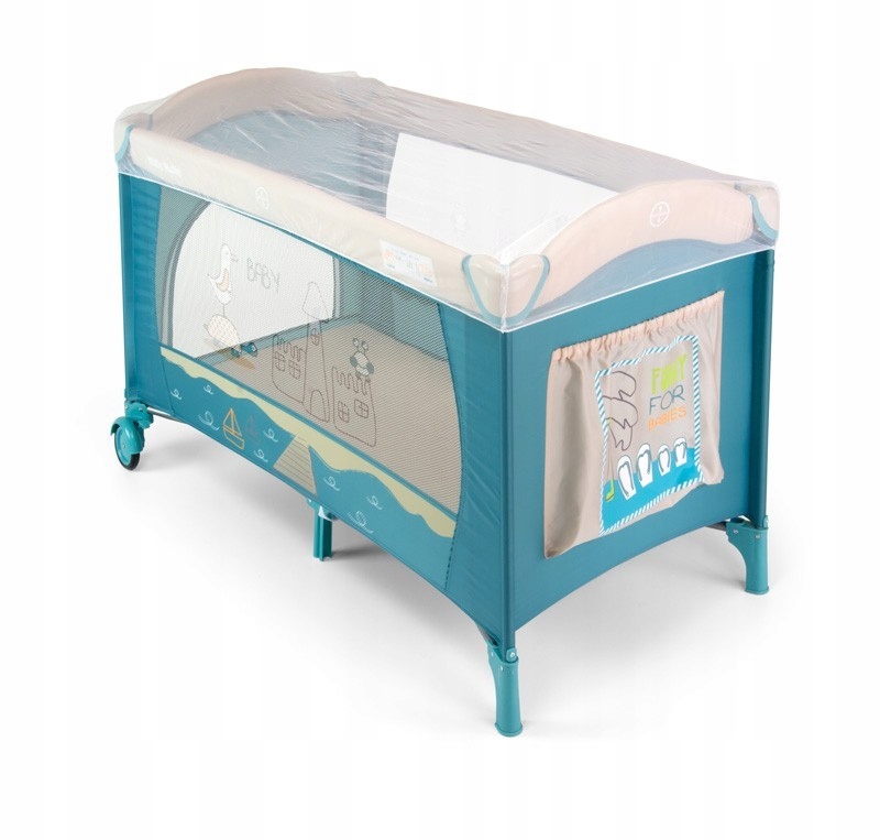 Москитная сетка белого цвета, отделанная декоративной окантовкой, крепящаяся на резинке на дорожном манеже размером 120х60 см, прекрасно защищает ребенка от насекомых в летнее время года и обеспечивает безопасную игру или спокойный сон.