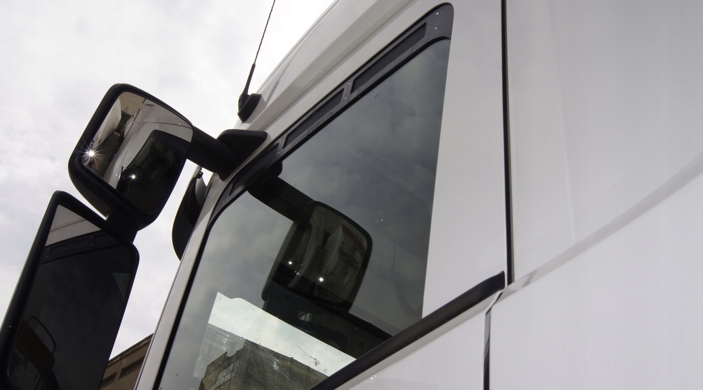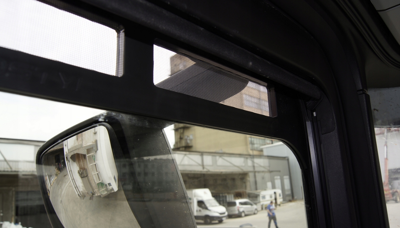 Москитная сетка для окна грузовика TRUCK MERCEDES, запрессованная в верхнюю часть оконного уплотнителя.