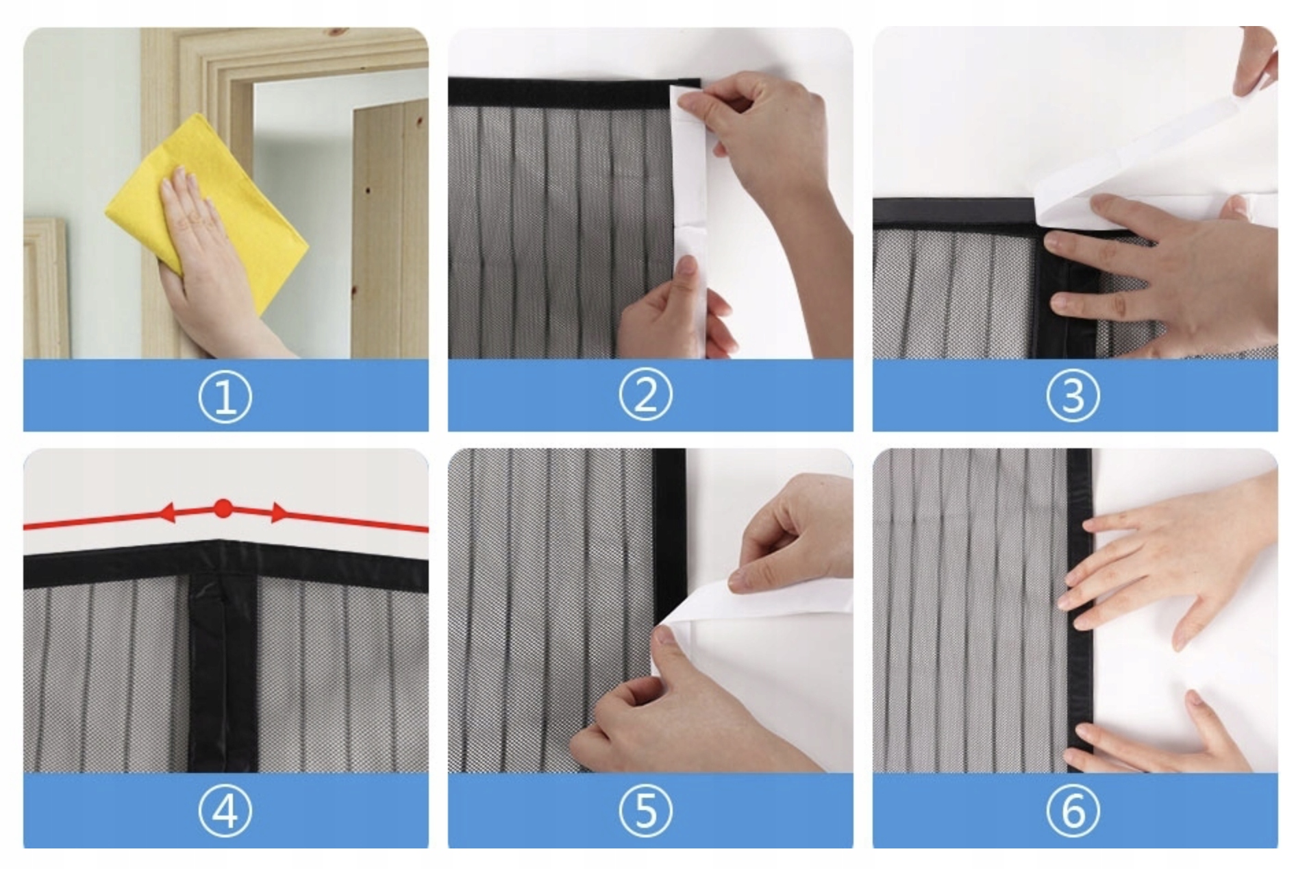 - Установка через несколько минут: просто тщательно очистите и высушите дверную раму, приклейте ленту, а затем прикрепите к нему комара. Нет инструментов, нет бурения, без повреждений!