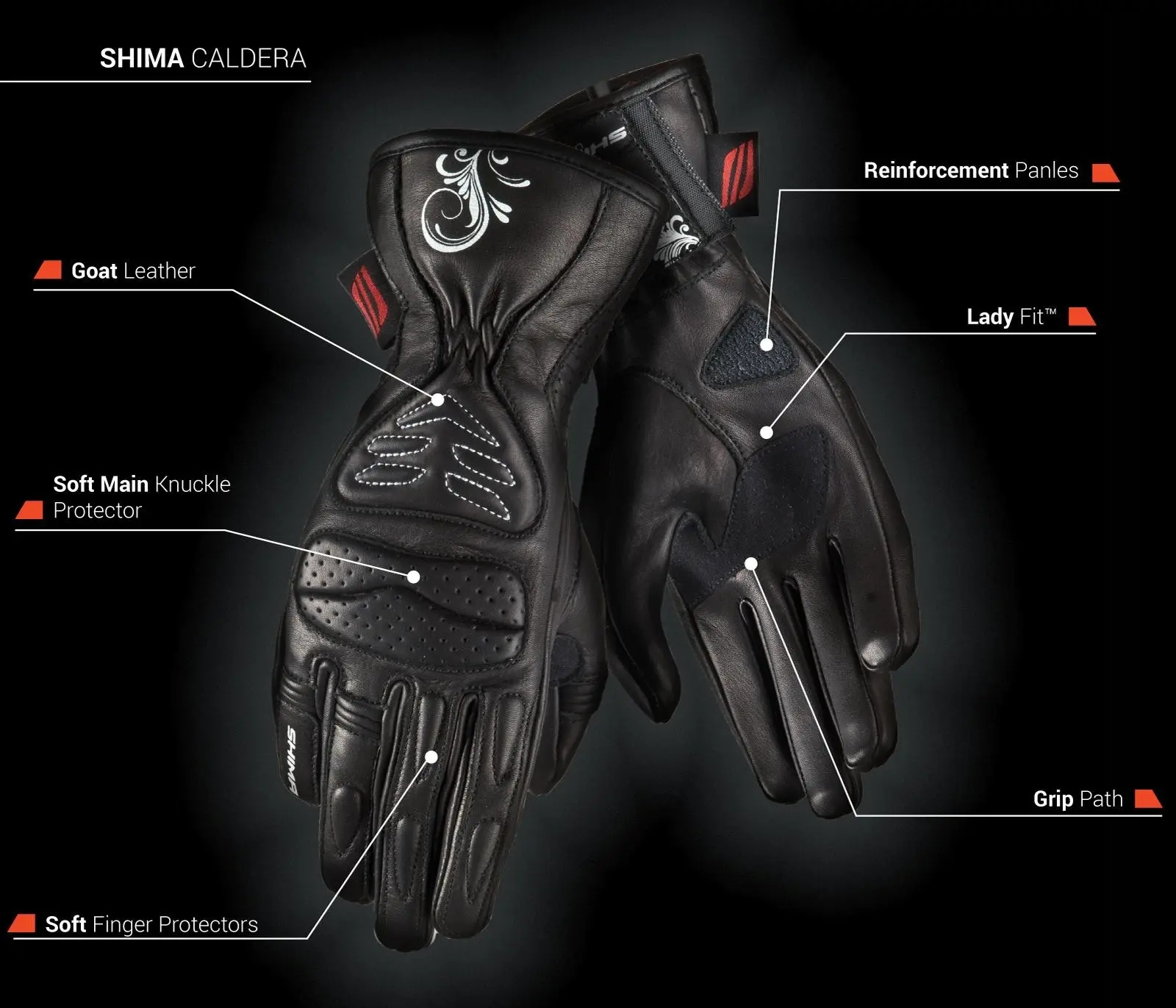 Caldera — модель перчаток, предназначенная для женщин. Они оснащены основной защитой из ударопоглощающей пены и панелями на запястьях из армированной ткани, защищающей от истирания. Перчатки изготовлены из натуральной кожи с вентиляционными вставками, обеспечивающими легкую циркуляцию воздуха вокруг рук. Особый дизайн моделей женских перчаток SHIMA учитывает анатомию женской руки – более длинные пальцы, более узкую пястную область и более тонкий силуэт руки.