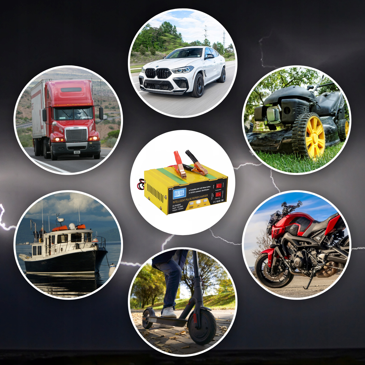 Совместимость с литиевой батареей 12,6 В или свинцово-кислотной батареей 12 В/24 В, водяной батареей, необслуживаемой батареей, сухой батареей, гелевой батареей, солнечной батареей и т. д., используемыми для скутеров , мотоциклы, зарядные автомобили, небольшие грузовики и т. д.