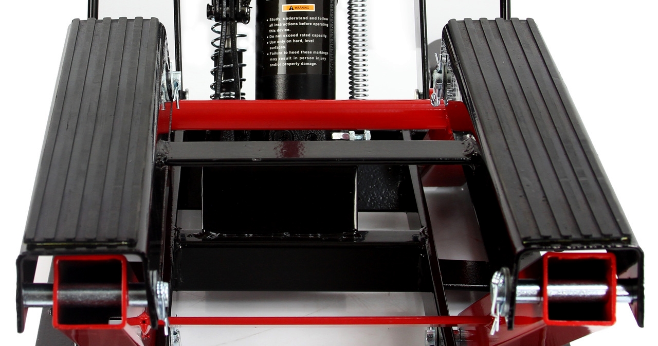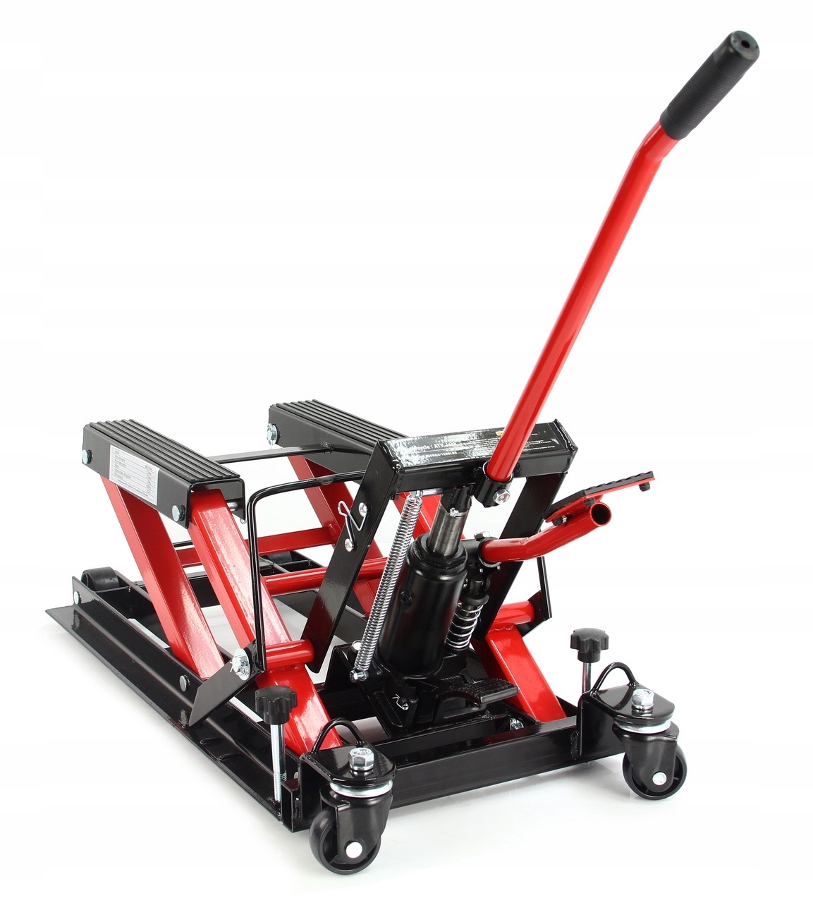 - Устройство, оснащенное 2 практичными ножными педалями, которые позволяют без особых усилий поднимать и опускать мотоцикл.