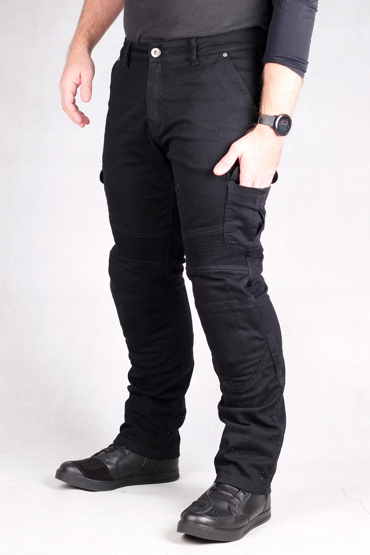Мотоштаны очень современного кроя в стиле боевых брюк. Высокий уровень безопасности обеспечивают кевларовые панели и наколенники. Очень прочные, прочные и безопасные джинсы, которые идеально сидят по размеру.
