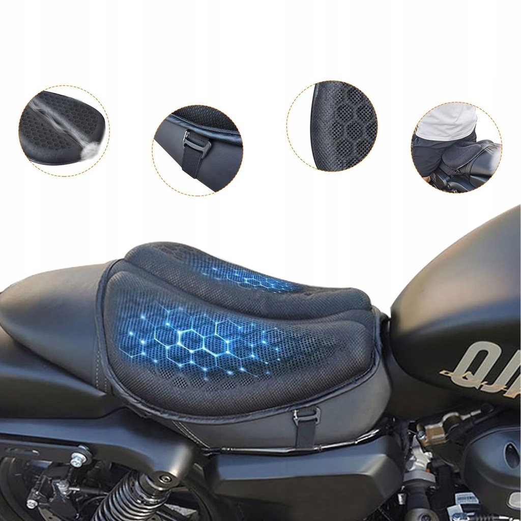 - Подушка сиденья мотоцикла имеет трехмерную сотовую структуру, которая циркулирует воздух быстрее, чем губчатая подушка, что может эффективно охлаждать и рассеивать тепло, защищая вас от пота и душной жары.