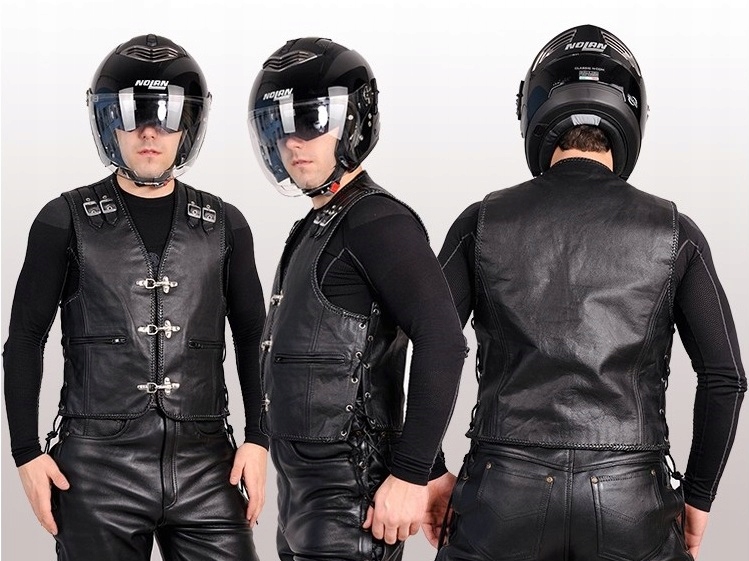 Кожаный мотоциклетный жилет с богатым декором, с кожаными краями, покрытыми ремнями, чрезвычайно прочными и прочными карабинами, хромированными люверсами, толстыми кожаными регулируемыми ремнями и, прежде всего, декоративные пряжки на плечах, которые придают ему неповторимый и неповторимый дизайн. Сшиты из больших листов кожи для предотвращения стыков в местах, где чаще всего пришиваются клубные нашивки или эмблемы. Идеально подходит как к куртке, так и к футболке.