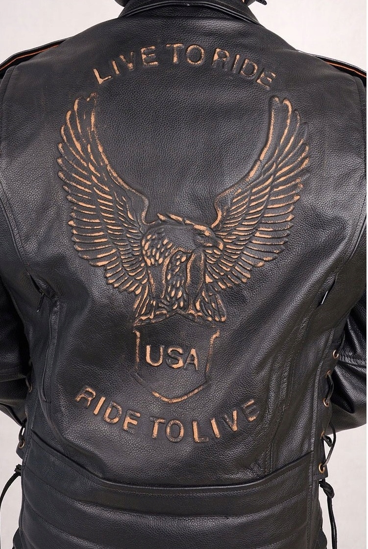 - крупное тиснение в виде коричневого орла «США» с культовой фразой «LIVE TO RIDE-RIDE TO LIVE».