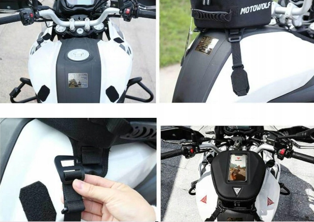 Практический пакет на мотоцикле для топливного бака, оснащенный универсальной системой сборки, которая соответствует почти каждому мотоциклу. Закрепление происходит в двух шагах: