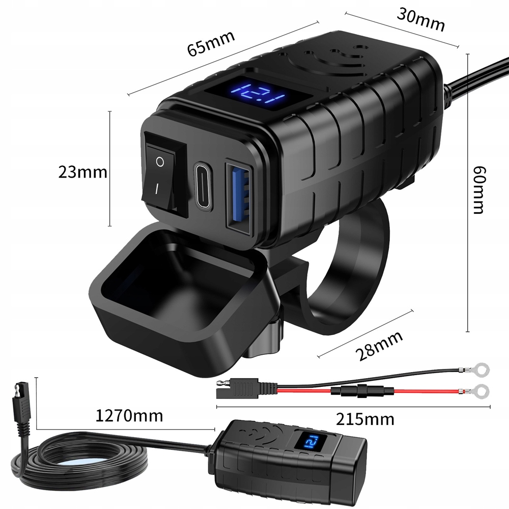 ВОДОНЕПРОНИЦАЕМОЕ ЗАРЯДНОЕ УСТРОЙСТВО USB + USB-C С БЫСТРОЙ ЗАРЯДКОЙ ДЛЯ МОТОЦИКЛА/СКУТЕРА QC 3.0 + ВОЛЬТМЕТР