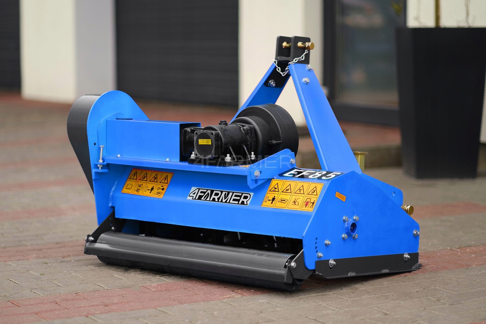 цеповая косилка (мульчер) EF 85 4FARMER имеет ширину среза 85 см, при этом в предложении имеется семь доступных вариантов ширины. Помимо цельного рабочего вала, оснащенного горизонтально расположенными измельчающими битами, косилка имеет еще задний (ведомый) вал. Он позволяет регулировать высоту среза и удерживать косилку на выбранной высоте. Привод от ВОМ трактора составляет 540 об/мин.
