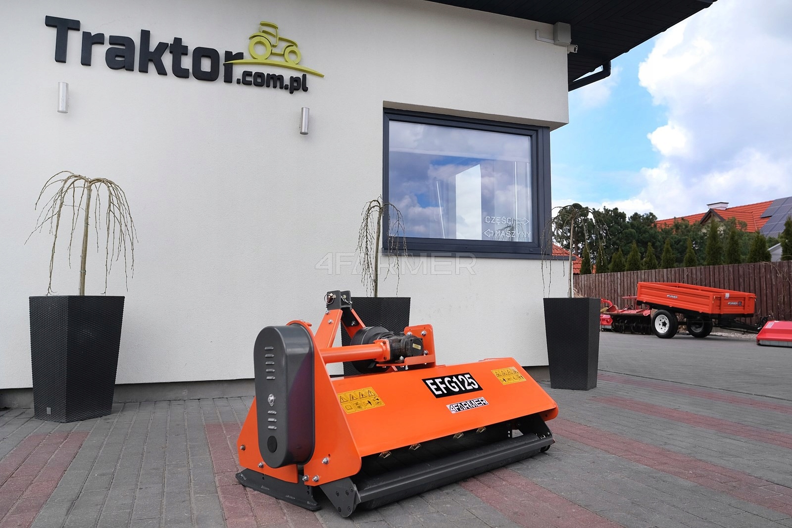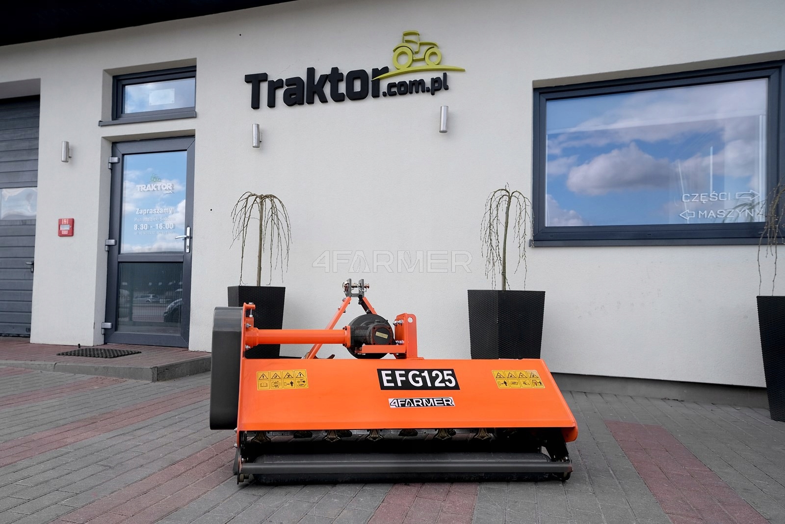 Цеп косилка (мульчер) EFG 125 4FARMER имеет ширину среза 125 см, в предложении представлено пять доступных вариантов ширины. Помимо цельного рабочего вала, оснащенного горизонтально расположенными измельчающими битами, косилка имеет еще задний (ведомый) вал. Он позволяет регулировать высоту среза и удерживать косилку на выбранной высоте. Привод от ВОМ трактора — 540 об/мин.