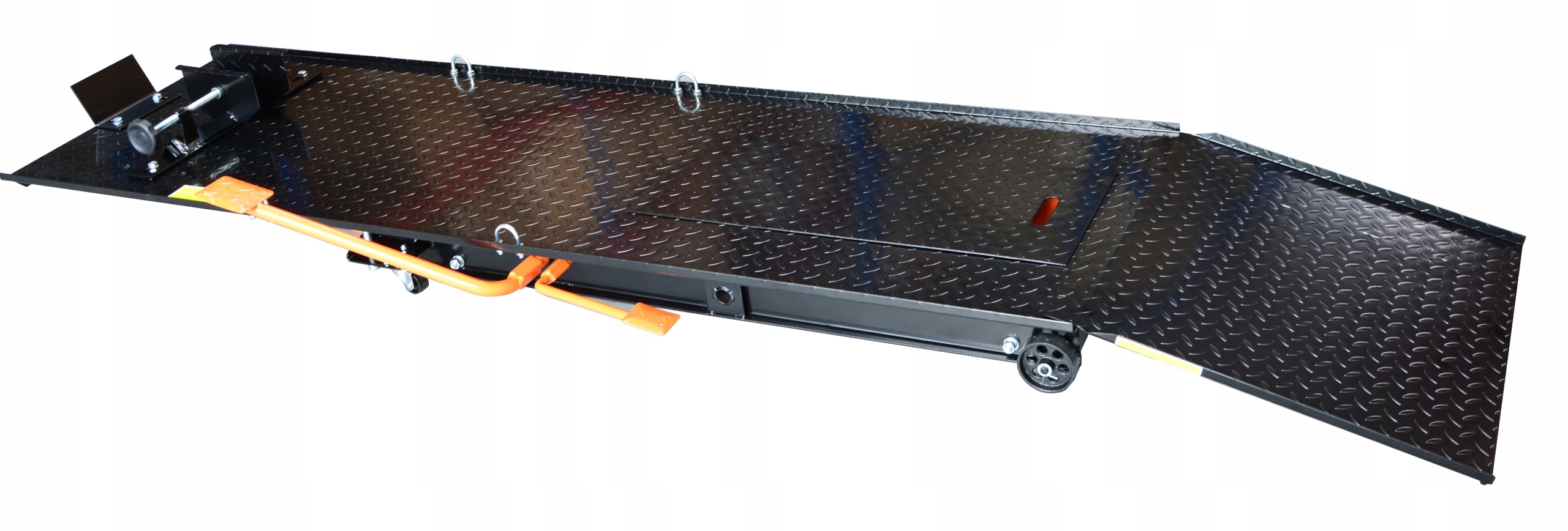 Мотоподъемник грузоподъемностью 450 кг с рампой, оснащенный гидроцилиндром и специальным крепежным отверстием, обеспечивающим быстрый доступ к мотоциклу снизу