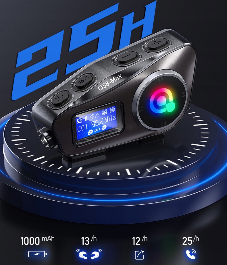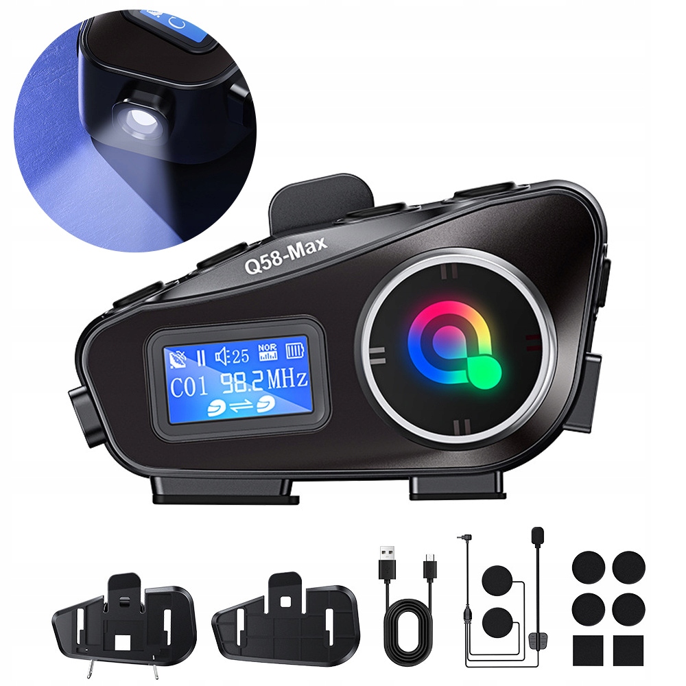Q58 -max Intercom. Мотоцикл Double Intercom - реальная интерком -интерком с расстоянием в любовнике или партнерах 500 м дисплей ЖК -дисплея - более интуитивное понимание ситуации с ситуацией интеркола CVC DSP. Поддержка карты MicroSD - поддержка SD -карты 4-32 ГБ радиорезистентности IP65 IP65 Bluetooth 5.3 Dual. Стабильная передача сигнала, более низкое энергопотребление музыкальная батарея батарея 1000 мАч - 13 часов разговора, 25 часов прослушивания музыкального водонепроницаемого IP65, смешивающего множество сцен - прослушивание музыки и навигации во время светодиода разговора - перед устройством есть светодиод. Подходит для широкого спектра шлемов