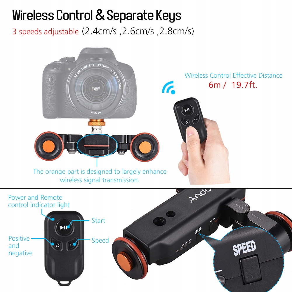 1. Модернизированная моторизованная тележка с индикацией масштаба, 3 регулируемые скорости (2,4 см/с, 2,6 см/с, 2,8 см/с); Переместите опору в противоположном направлении; Угол колеса 180°. Регулируемый, вы можете добиться творческого движения колеса/движения по прямой линии. Идеальная автоматическая тележка для видео/макросъемки/съёмки с низкого ракурса.
