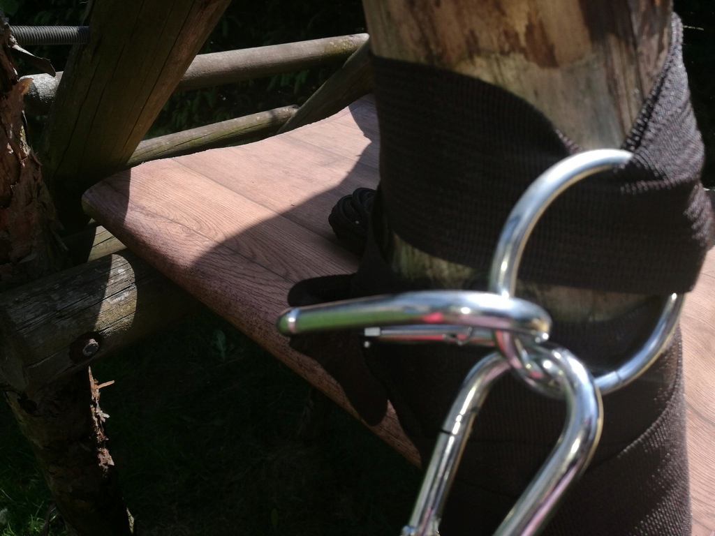 Толстая, широкая лента - веревка для подвешивания гамака, отделанная двумя карабинами .