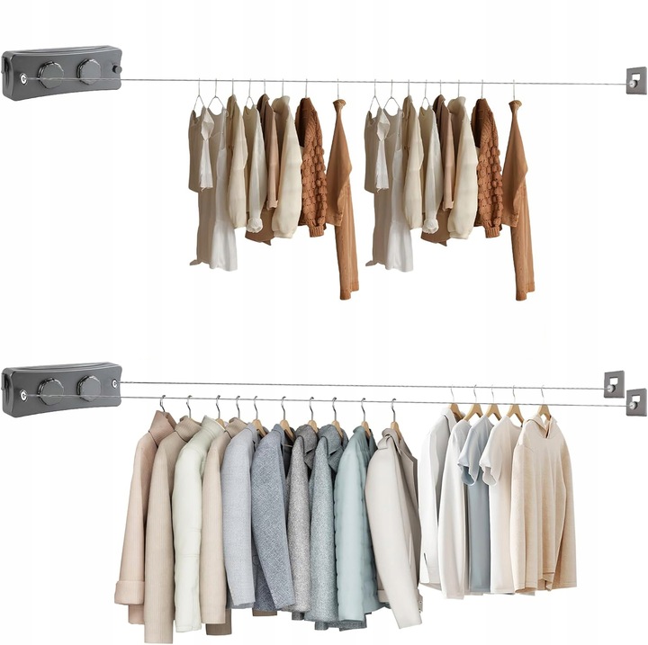 ◾Выдвижная бельевая веревка имеет противоударную конструкцию с запирающим механизмом и поворотным натяжителем, который регулирует натяжение в соответствии с размером комнаты и весом одежды. Если вам нужно сушить большое количество белья, и оно провисает, просто зафиксируйте белье и покрутите шнур на натяжителе, чтобы решить проблему провисания.