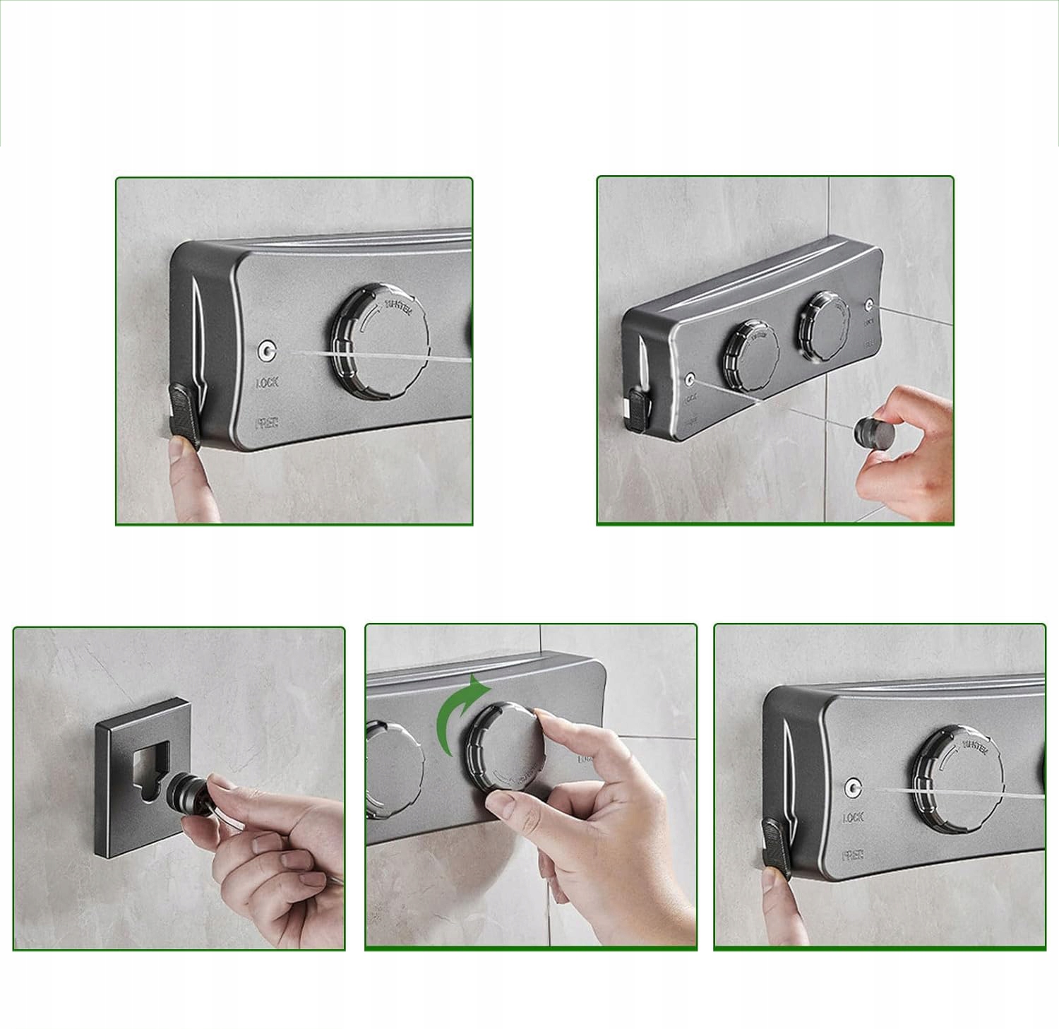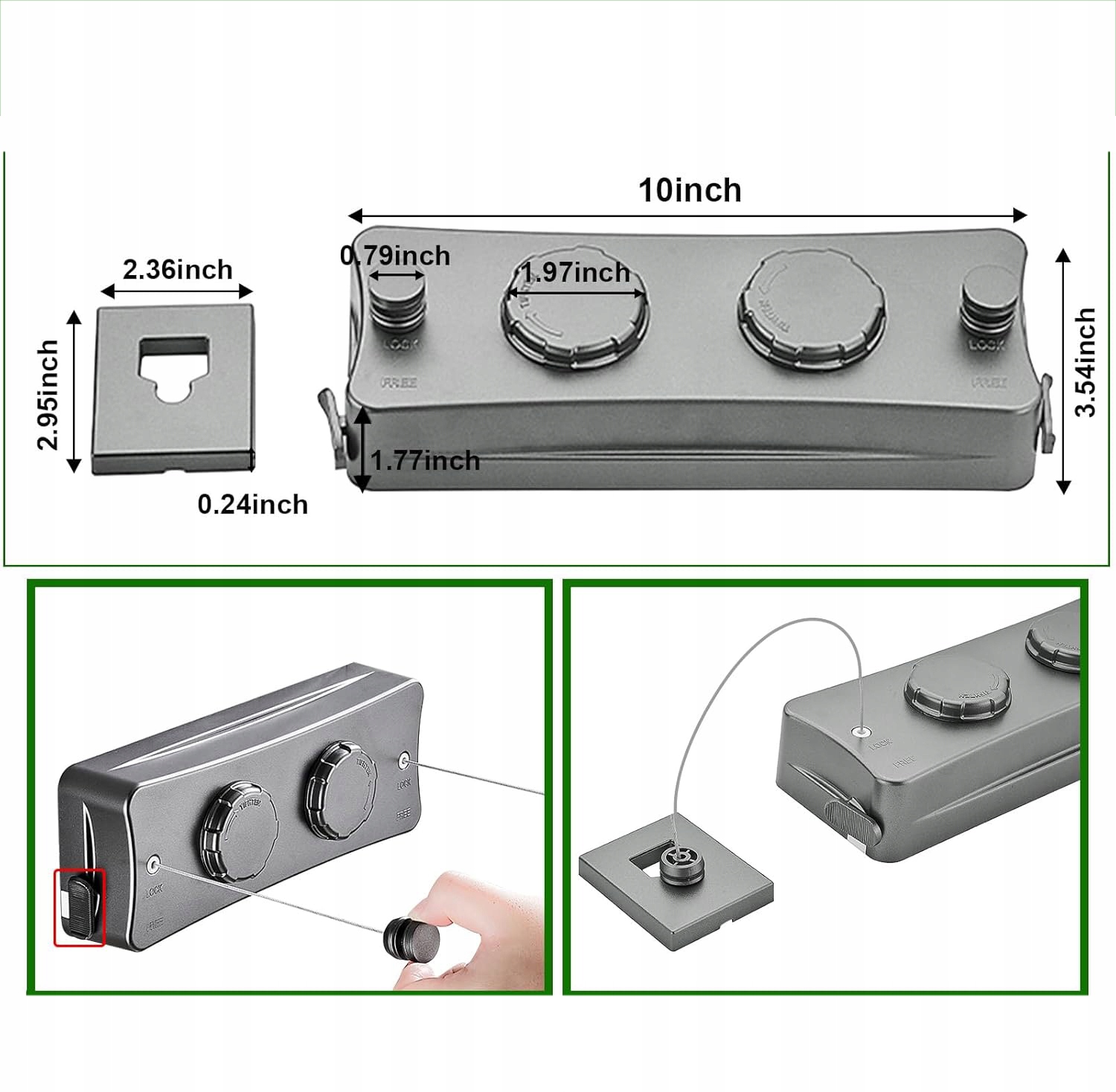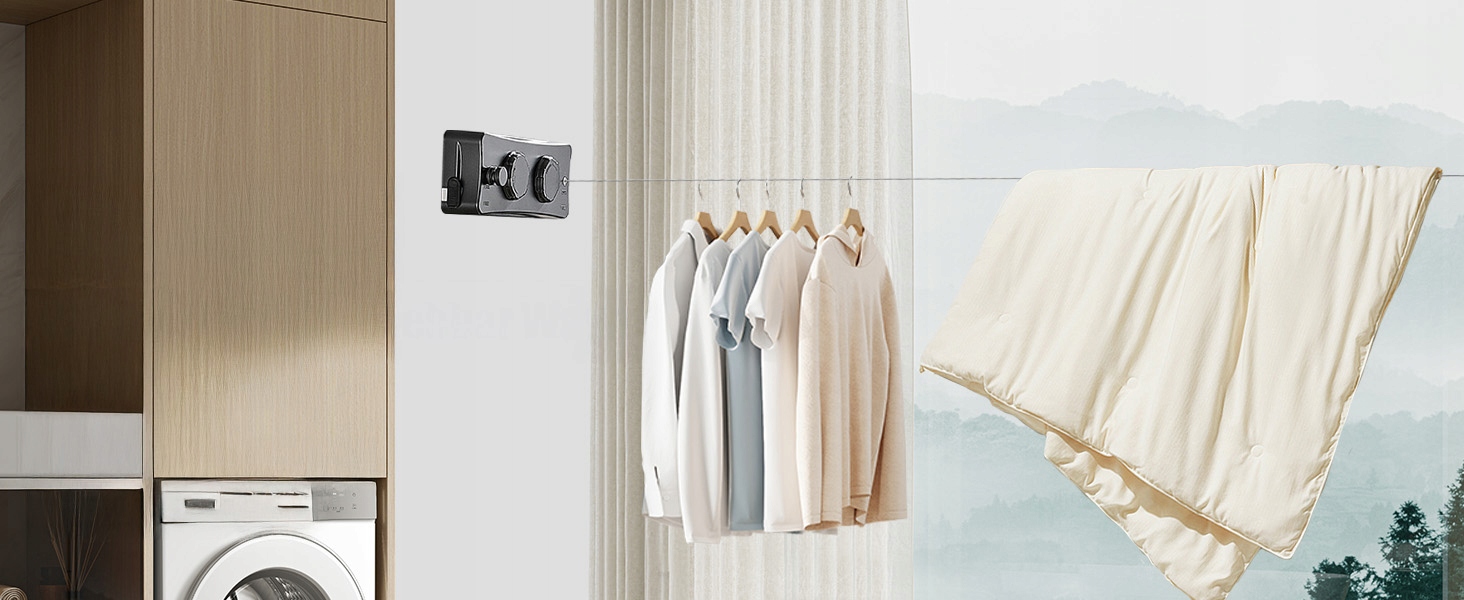 👗👗 Встроенный натяжитель бельевой веревки — всего три шага. Вытяните веревку нужной длины, нажмите кнопку блокировки и поверните ручку, чтобы затянуть веревку на бельевой веревке и предотвратить ее свисание. Затем вы можете повесить одежду.