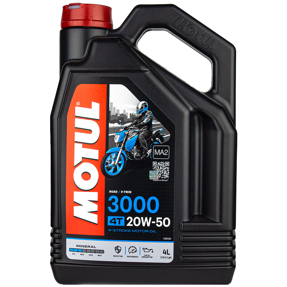 Motul 3000 20W50 4T — минеральное масло для четырехтактных двигателей. Обеспечивает защиту двигателя и коробки передач. Соответствует требованиям Harley-Davidson®. Соответствует требованиям JASO MA2; противоскользящая технология для мокрых сцеплений. Также для систем с каталитическим нейтрализатором.