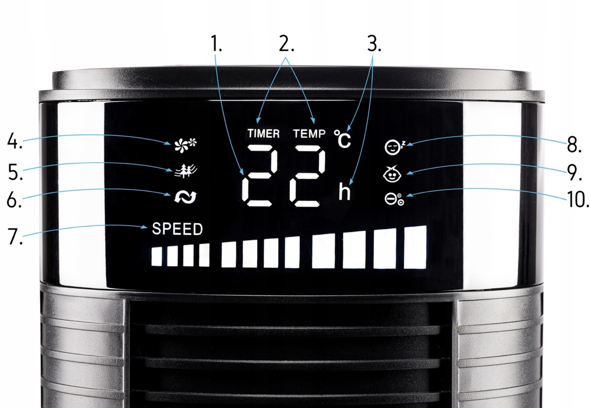 7️⃣ Выключатель светодиодного дисплея — нажмите соответствующую кнопку на пульте дистанционного управления и выключите индикацию работающего вентилятора, чтобы можно было спокойно спать в полной темноте.