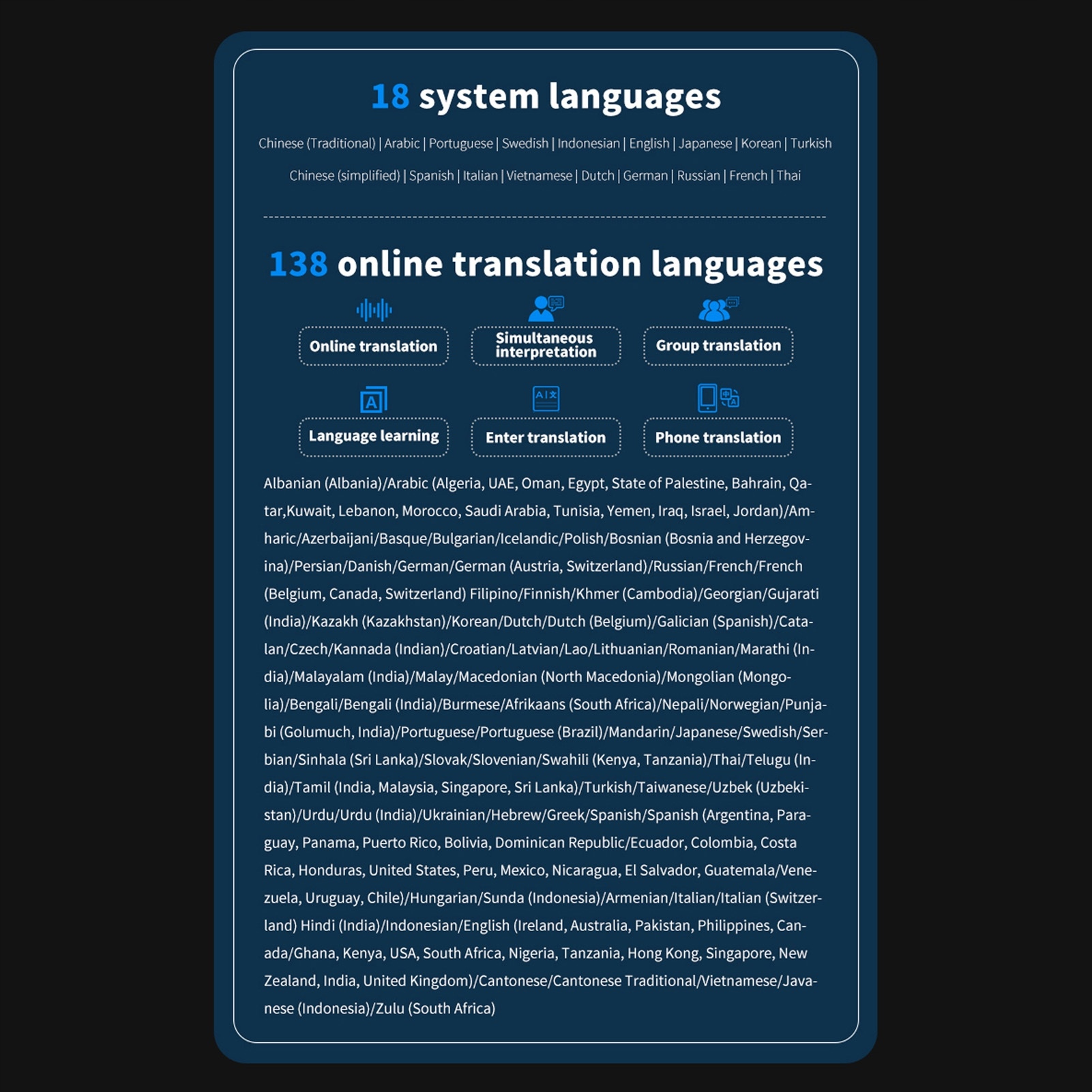 1. Многоязычный TuNaMac: после подключения к Интернету AI-голос TuNaMac поддерживает 138 языков TuNaMac, а также TuNaMac на любом языке. Высокая точность настройки и четкий голосовой вывод позволяют легко общаться, несмотря на границы и культуры.