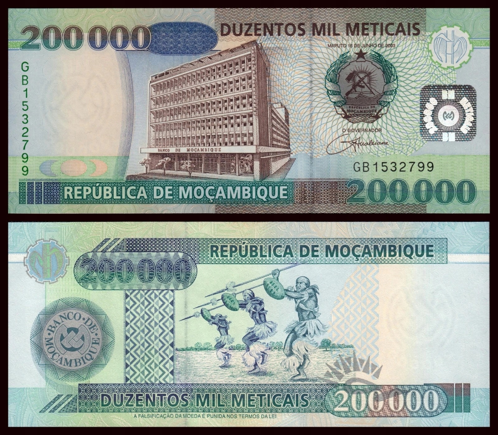 Красивая банкнота номиналом 200 000 Meticais из Мозамбика 2003 г. (P-141) в абсолютно идеальном банковском состоянии I (UNC).