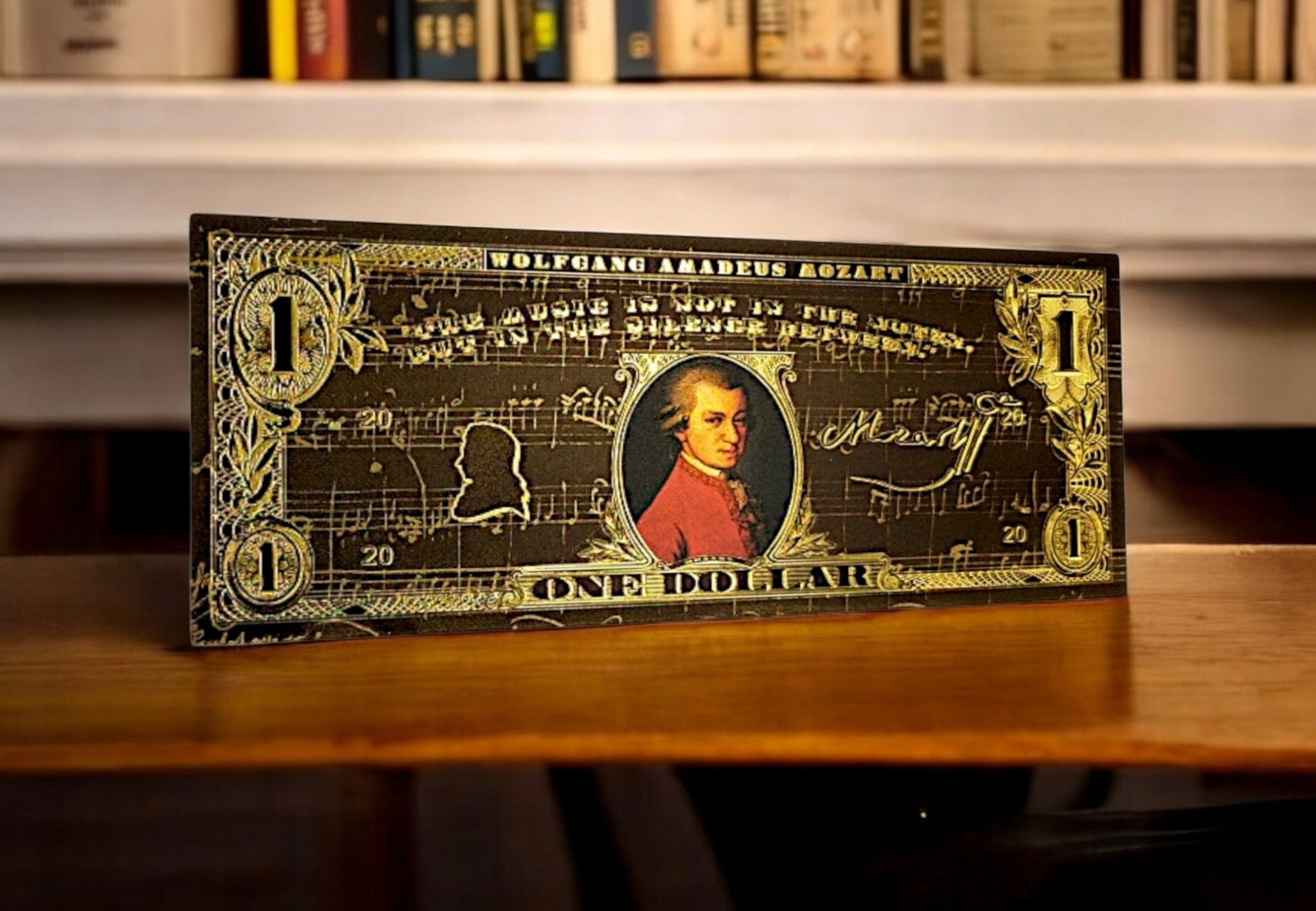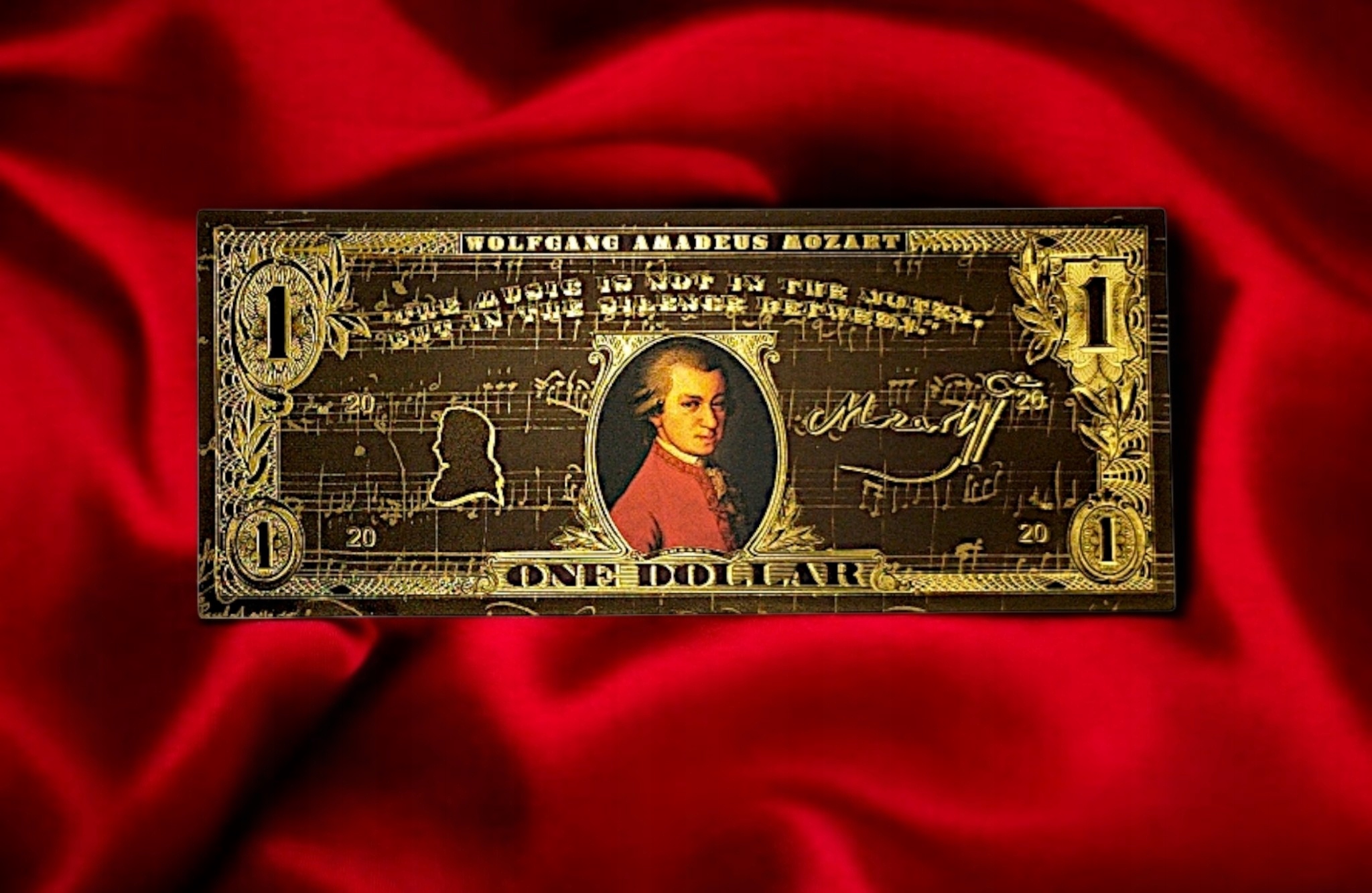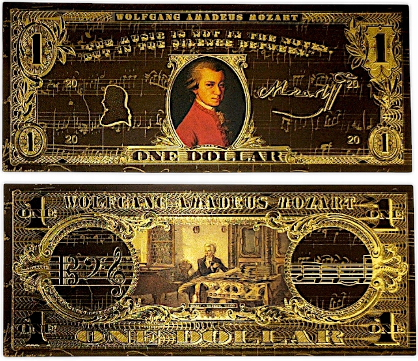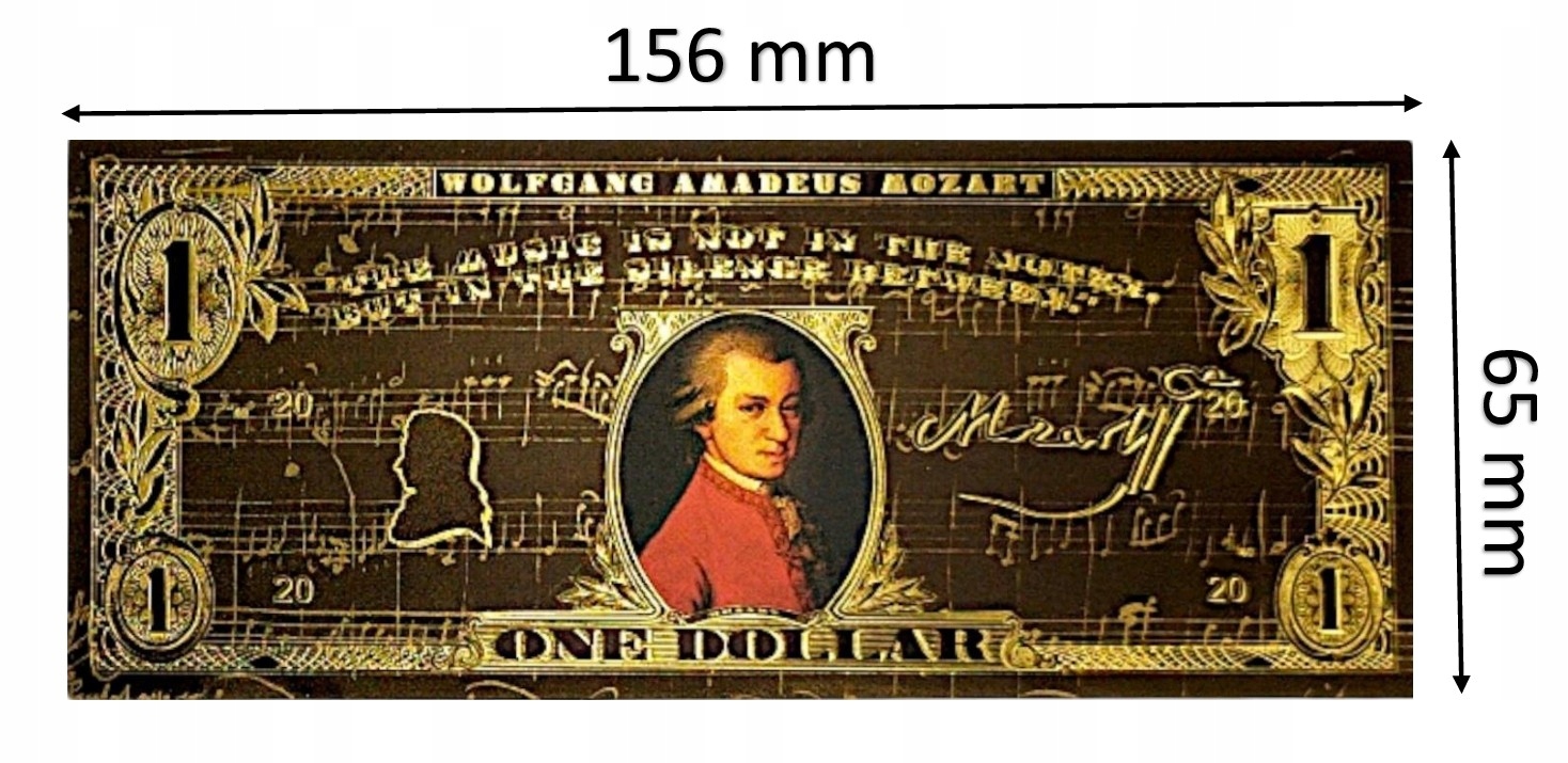 Если вы любите классику, искусство и элегантность, эта причудливая банкнота с Вольфгангом Амадеусом Моцартом создана для вас! ✨ h2> Золотой черный дизайн, богатые украшения и цитата Music Master делают его не только красивым предметом коллекционера, но и уникальным подарком для каждого поклонника классической музыки