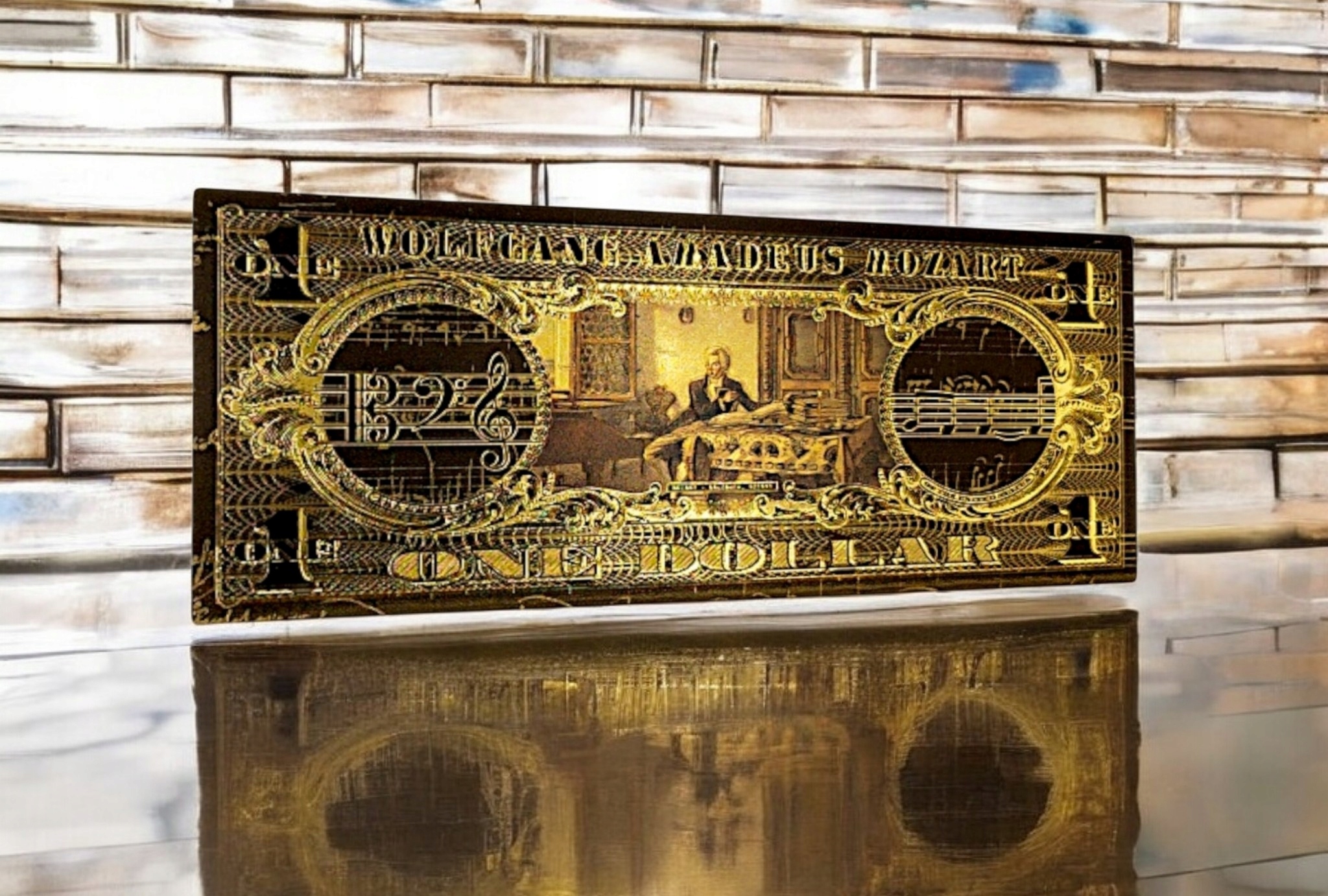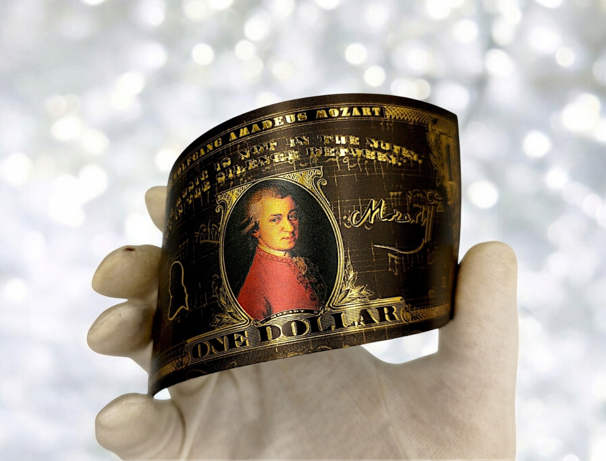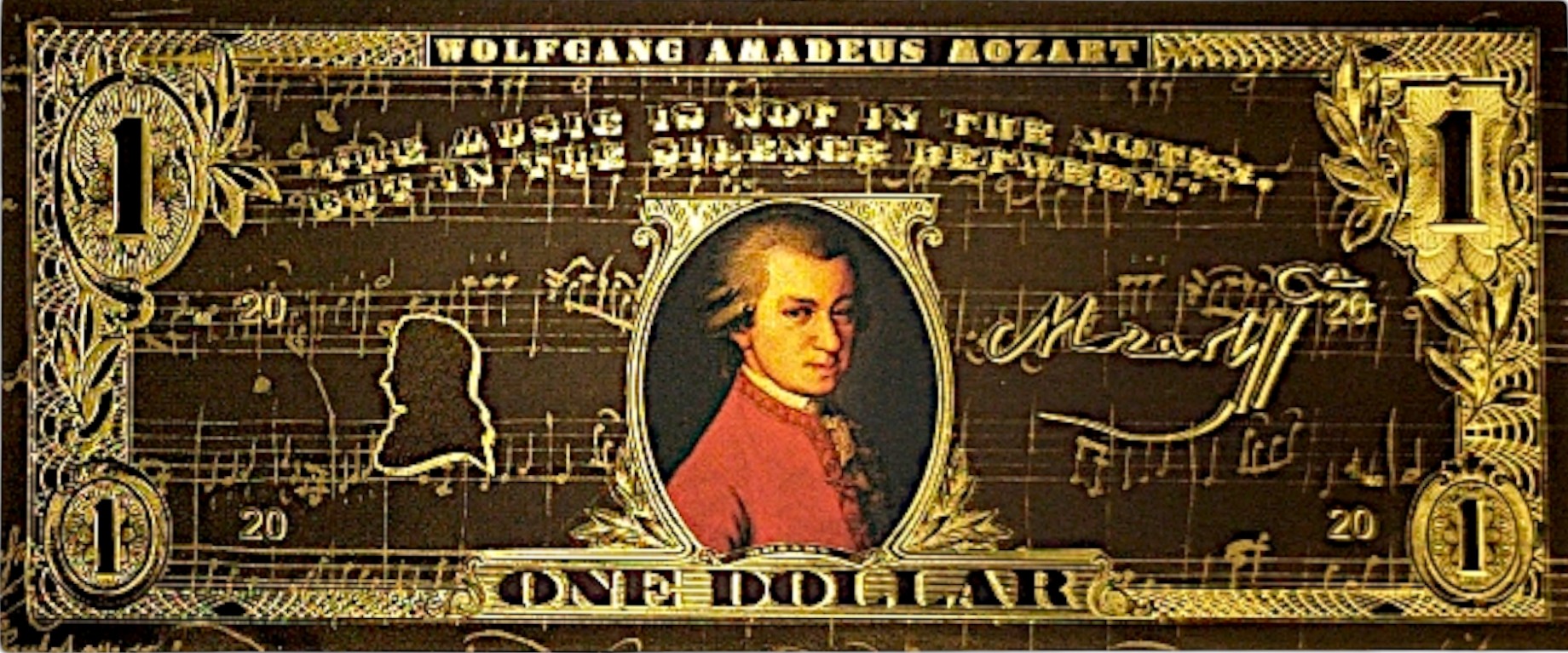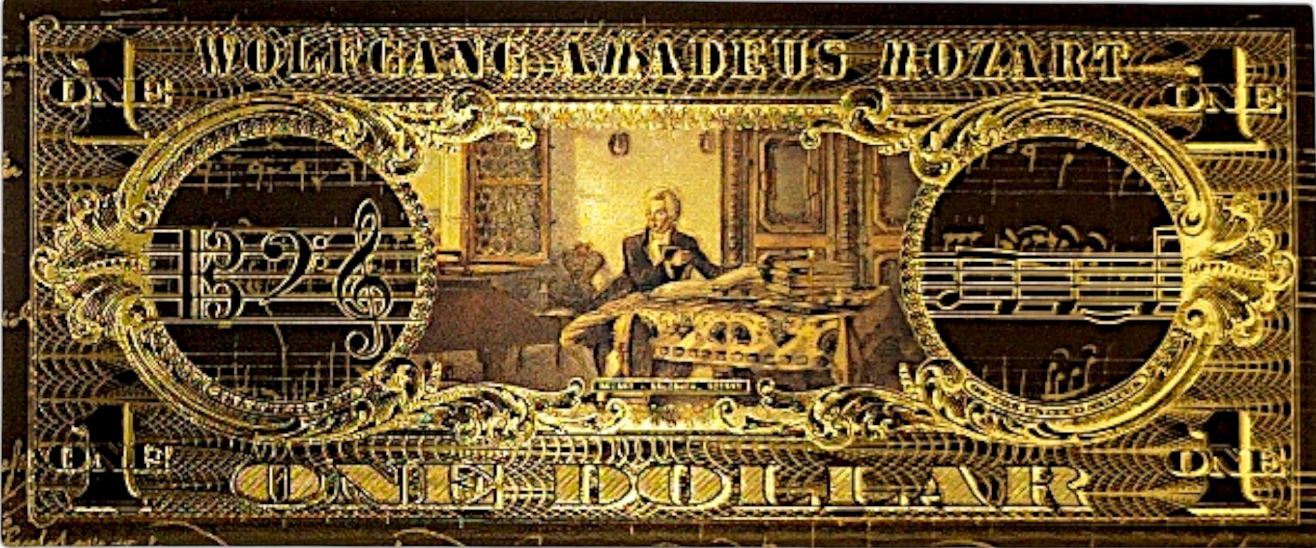 Если вы любите классику, искусство и элегантность, эта причудливая банкнота с Вольфгангом Амадеусом Моцартом создана для вас! ✨ h2> Золотой черный дизайн, богатые украшения и цитата Music Master делают его не только красивым предметом коллекционера, но и уникальным подарком для каждого поклонника классической музыки