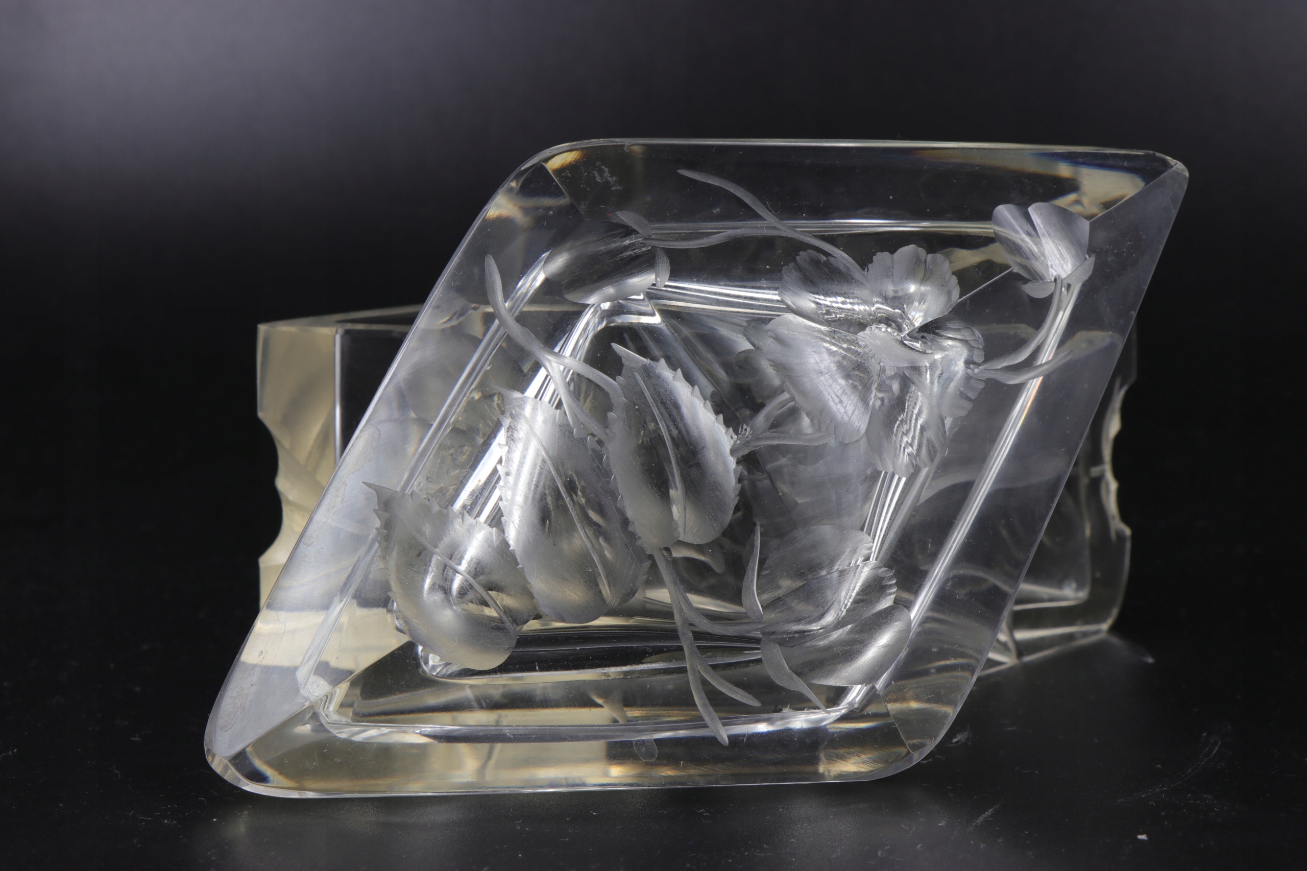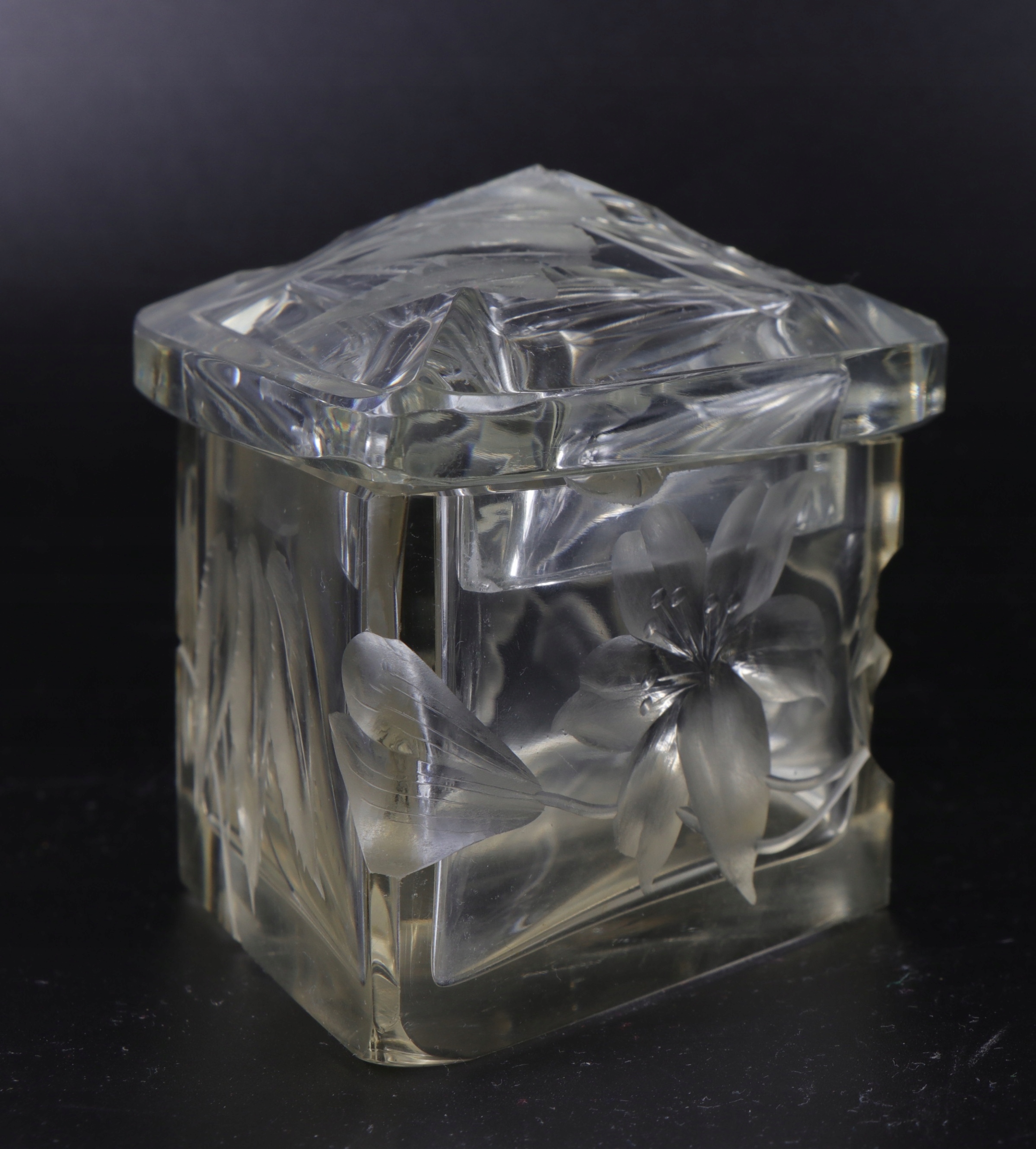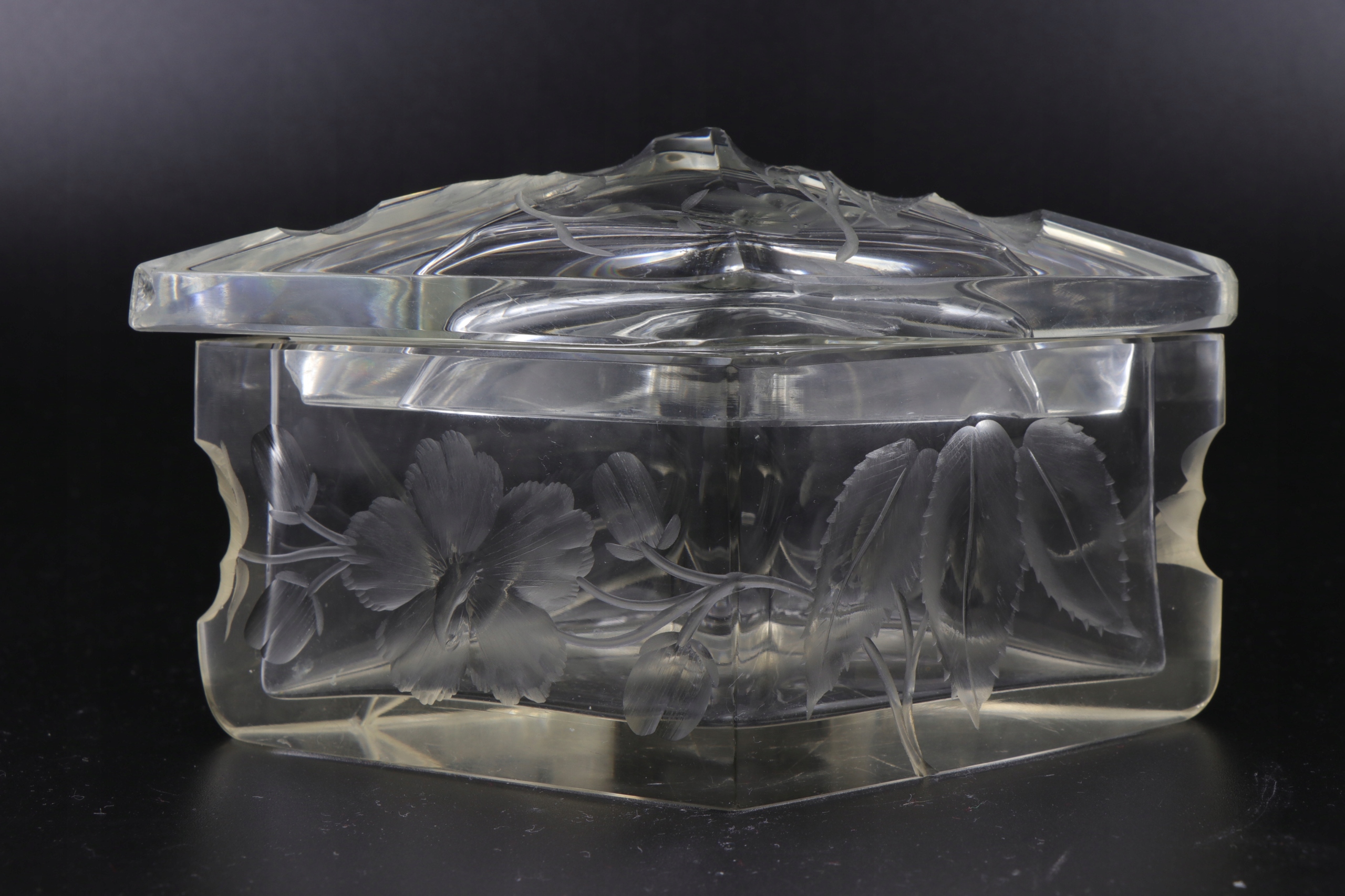 Очень интересная и редкая коробка конфет Moser, украшенная вырезанным узором из ирисов и маков. Бонбоньерка не подписана, но изделия с подобным декором по вырезу производились только компанией Moser.