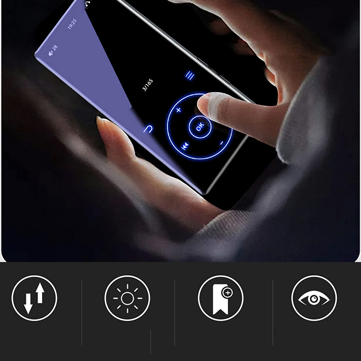 - простой в использовании и использовании. MP3 -плеер оснащен 7 сенсорными кнопками с высокой чувствительностью, поэтому вы можете использовать его более эффективно и без шума. Независимые кнопки предотвращают неправильную работу. Кнопки могут быть выделены синим цветом для ночного использования. Зарядка длится 2 часа. Встроенная в памяти 16 ГБ, поддерживающая карты Micro SD с емкостью до 128 ГБ, позволяет хранить более 5000 песен и книг