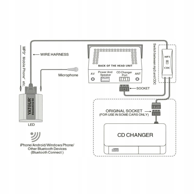 Совершенно новый комплект/чейнджер громкой связи от Yatour позволяет подключаться к плееру вашей компании вместо стандартного чейнджера, совершать телефонные звонки и отправлять музыку через Bluetooth (протокол A2DP) с любого устройства, телефона, ноутбука, планшет и т. д., устройство также имеет вспомогательный вход к которому можно подключить любое устройство.