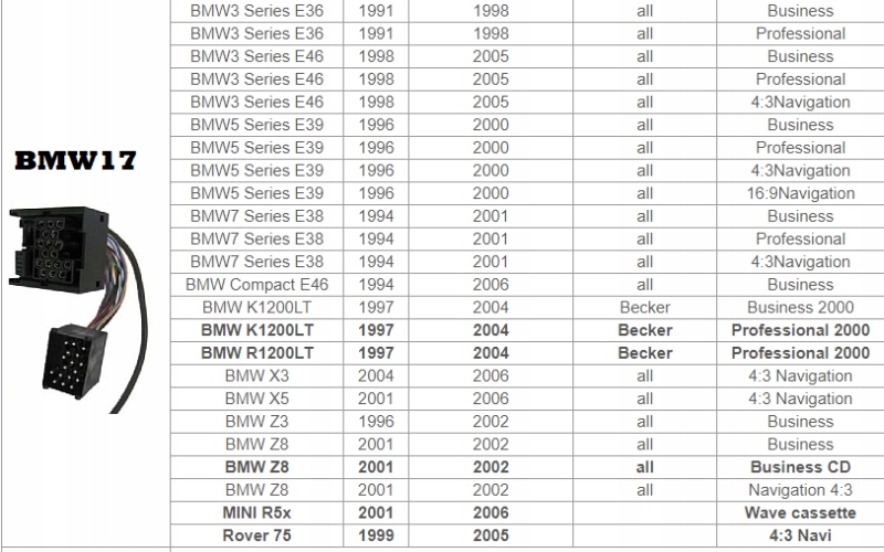 BE3350 (кассета Business), BE3351 (кассета Business), BP0273 (CD Business), BE6510 (Professional), BP8272 (CD Business), BP9272 (CD Business), PH7050 ( Бизнес-кассета), PH7070 (Бизнес-кассета), PH7090 (навигационная система), PH7860T (Бизнес-RDS), PH7950(Бизнес-кассета), PH8060 (Бизнес-CD), PH9860 (БИЗНЕС-CDRDS), Авторадио(не DSP), BordMonitor,BMW с монитором (не DSP), Business CDRDS, навигационная система, автомагнитола и т. д.