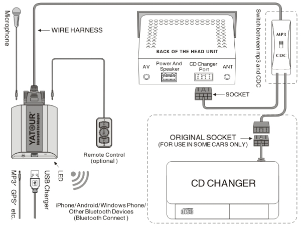 Новый комплект громкой связи от Yatour позволяет подключаться к вашему фирменному плееру вместо стандартного чейнджера, совершать телефонные звонки и отправлять музыку через Bluetooth (протокол A2DP) с любого устройства: телефона, ноутбука, планшета, и т. д., устройство также имеет вспомогательный вход. к которому мы можем подключить любое устройство, а также зарядное устройство USB, от которого мы можем заряжать наше мобильное устройство. К устройству можно назначить до двух телефонов.