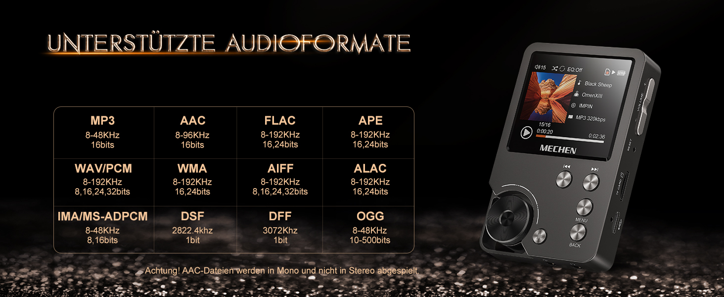 - Элегантный дизайн - музыкальный плеер MECHEN оснащен 2,0-дюймовым HD-дисплеем с высокой четкостью и контрастностью. Корпус из цинкового сплава с ЧПУ имеет высокое качество и приятен для пользователя. сенсорный. Благодаря колесику прокрутки им легко пользоваться.