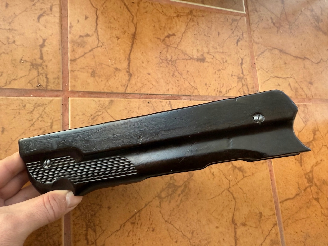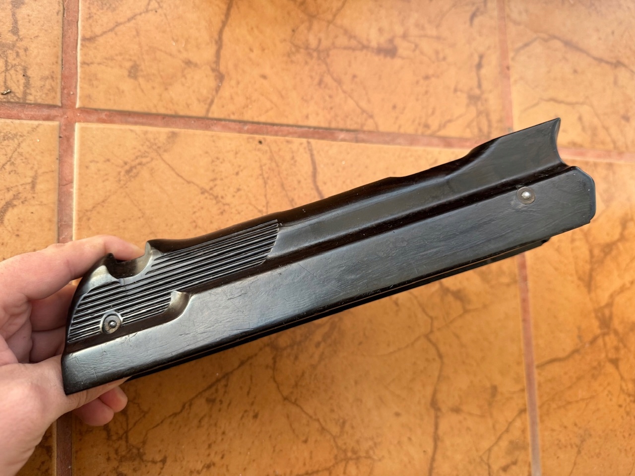 Оригинальное 2 войны корпуса для MP40, существует 100% оригинал, не лиц / экзема из формы для PLN 870. Темно -коричневый материал Bacilitus, подписанный с кодом производителя GBM и логотипом производителя, включены оригинальные монтажные винты. Отсутствие трещин, чипсов или полостей, вам нужно только очистить смазку. Элемент, который трудно получить, и, конечно, не в этом состоянии. Я рекомендую
