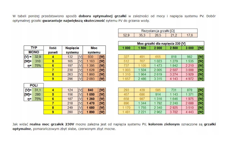 Как видите Реальную мощность нагревателей 230 В сильно зависит от напряжения фотоэлектрической системы, зеленые отмечены оптимальными обогревателями , апельсиновые, слишком слабые, слишком слабые красные.
