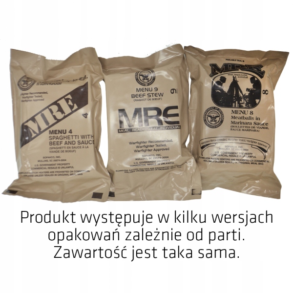 Оригинальный продовольственный рацион армии США MRE (Meal, Ready-to-Eat) рассчитан на одного человека. Все это было закрыто в плотную упаковку, благодаря чему имеет длительный срок хранения. Кроме того, каждый продукт имеет внутри отдельную упаковку. Рационы готовятся с использованием беспламенного химического нагревателя, поэтому мы можем съесть горячую еду, не разжигая огонь. В каждом меню есть отдельное основное блюдо.