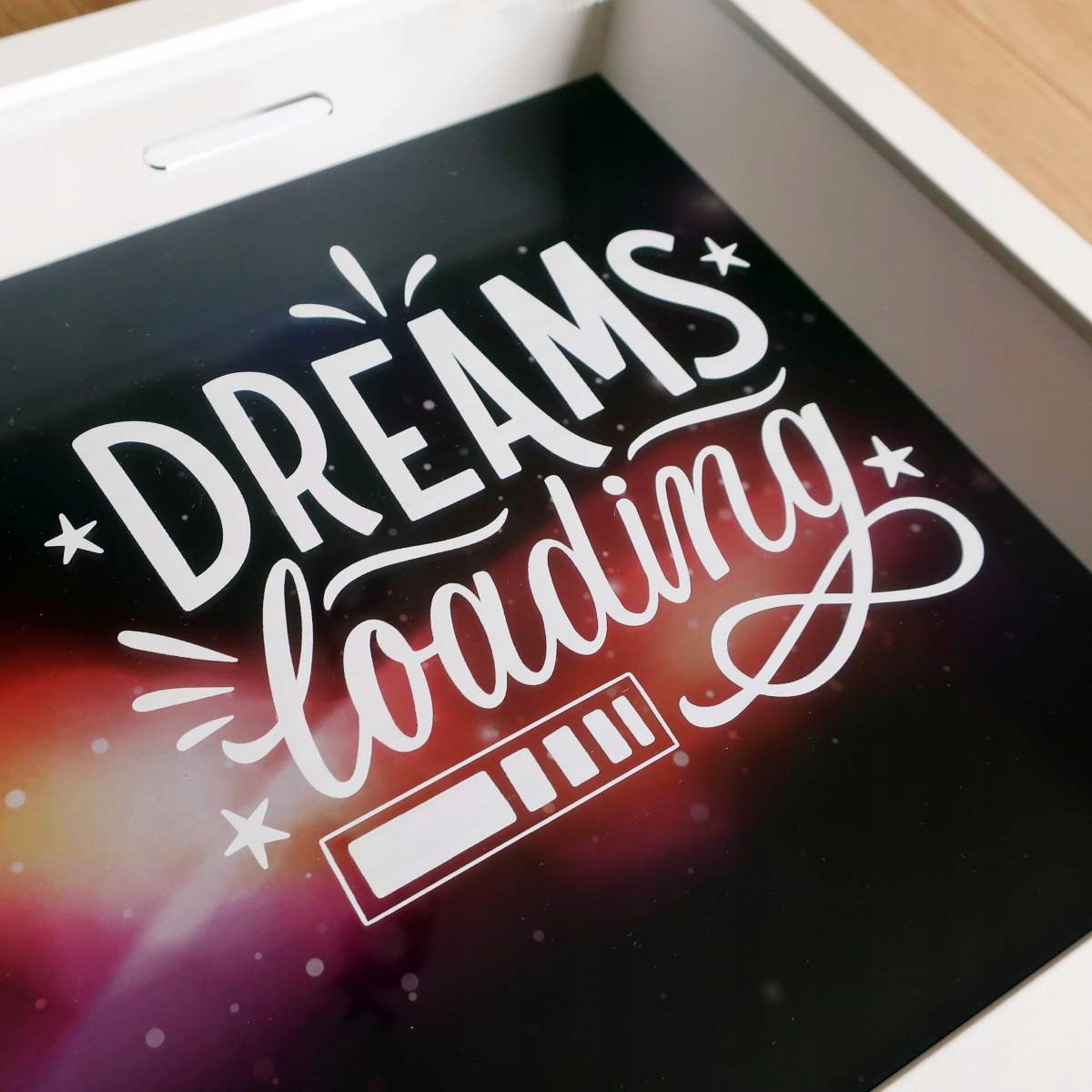 «Мечты заряжаются…» — сколько смысла может иметь такая простая фраза? В нашей рамке-копилке «Загрузка Мечт» эта идея представлена белой стилизованной надписью на прозрачном оргстекле, которая в совокупности с индикатором выполнения создает уникальный дизайн. Кроме того, темный фон со звездами создает уникальный контраст с белой надписью, что придает всему произведению своеобразный характер.