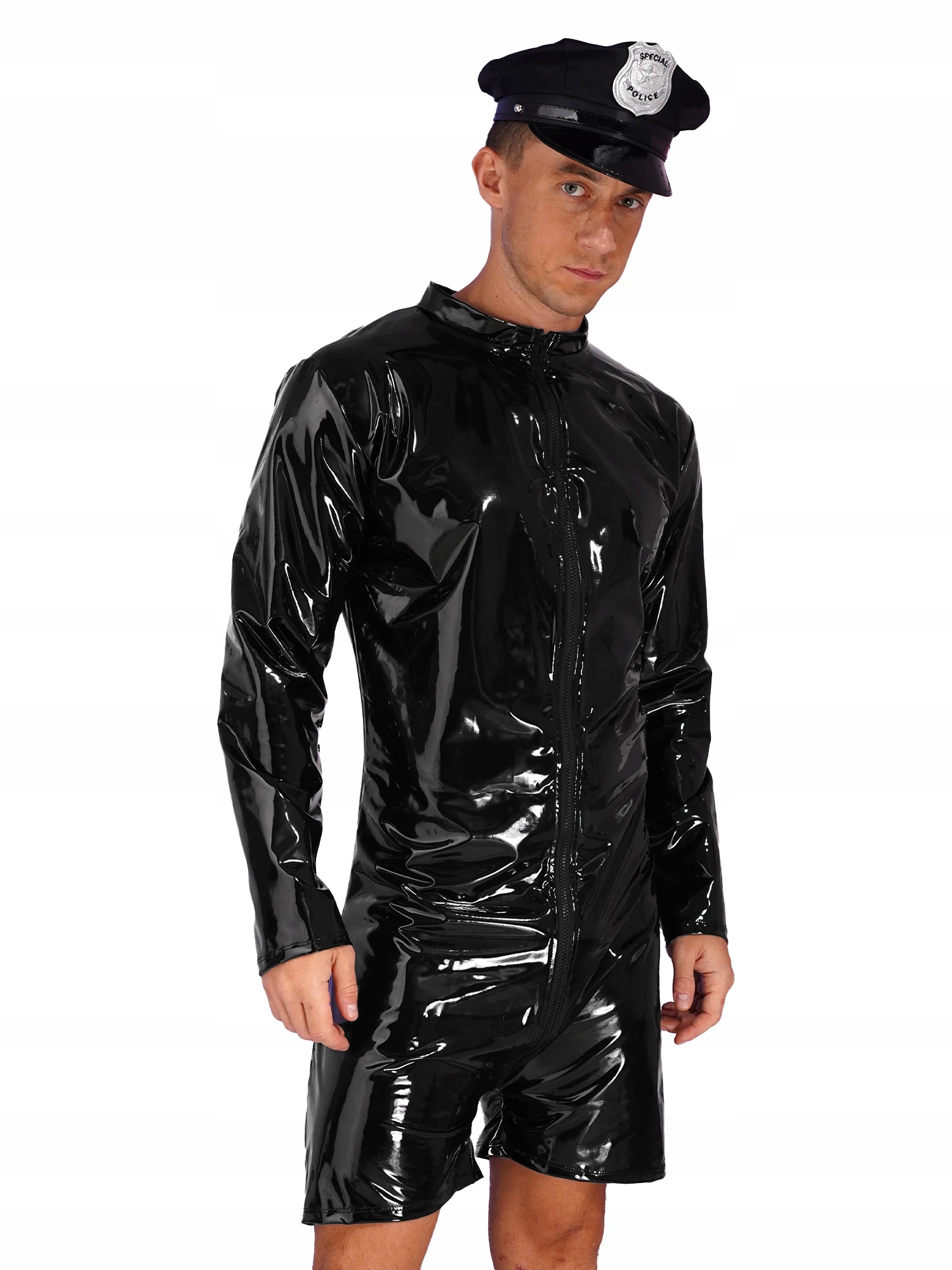 męskie przebranie Wet Look kostium policjanta z czapką bdsm zamek czar XXL