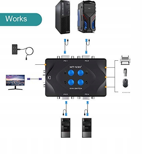 KVM-переключатель VGA MT-VIKI — идеальное решение для тех, кто хочет эффективно управлять несколькими компьютерами, используя один комплект клавиатуры, мыши и монитора. Этот 4-портовый KVM-переключатель отличается превосходным качеством сборки и функциональностью, которая удовлетворит потребности как домашних пользователей, так и профессионалов.